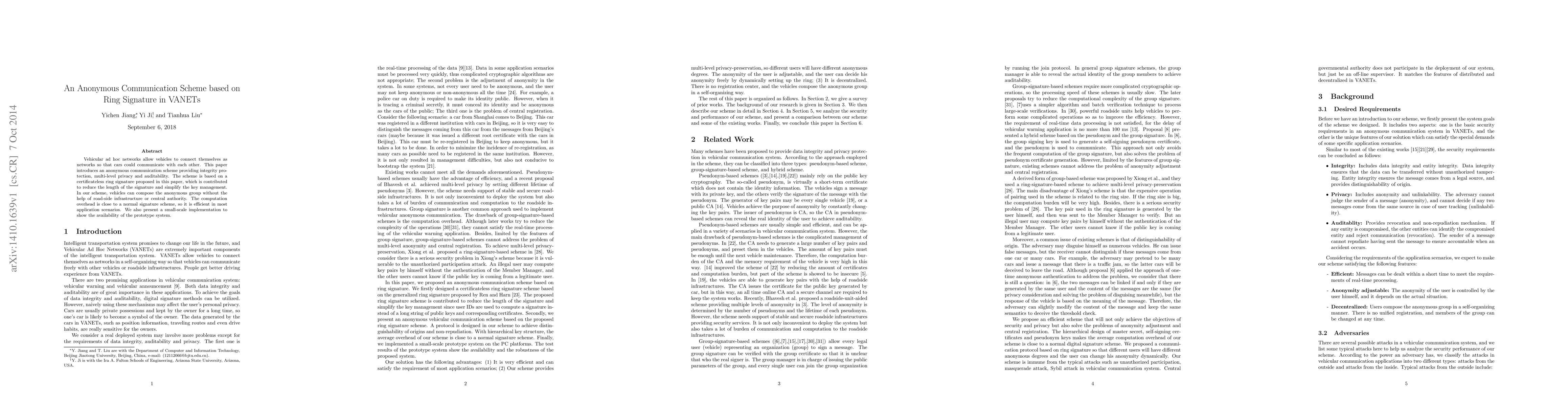 This paper proposes an anonymous communication scheme for Vehicular Ad Hoc Networks (VANETs) using a certificateless ring signature to ensure integrity, multi-level privacy, and auditability. The scheme reduces signature length and simplifies key management, enabling vehicles to form anonymous groups without central authorities, while maintaining efficient computation overhead.