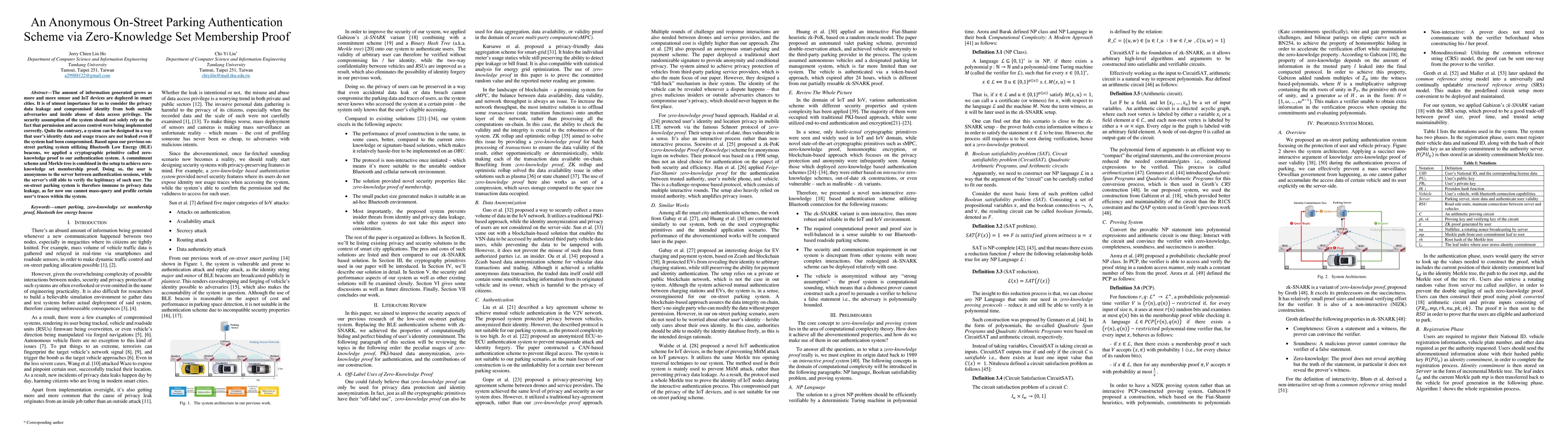 This paper proposes an anonymous on-street parking authentication scheme using zero-knowledge set membership proof, combining a commitment scheme and Merkle tree to ensure user anonymity while allowing the server to verify legitimacy, thereby preventing privacy data leakage and identity compromise.