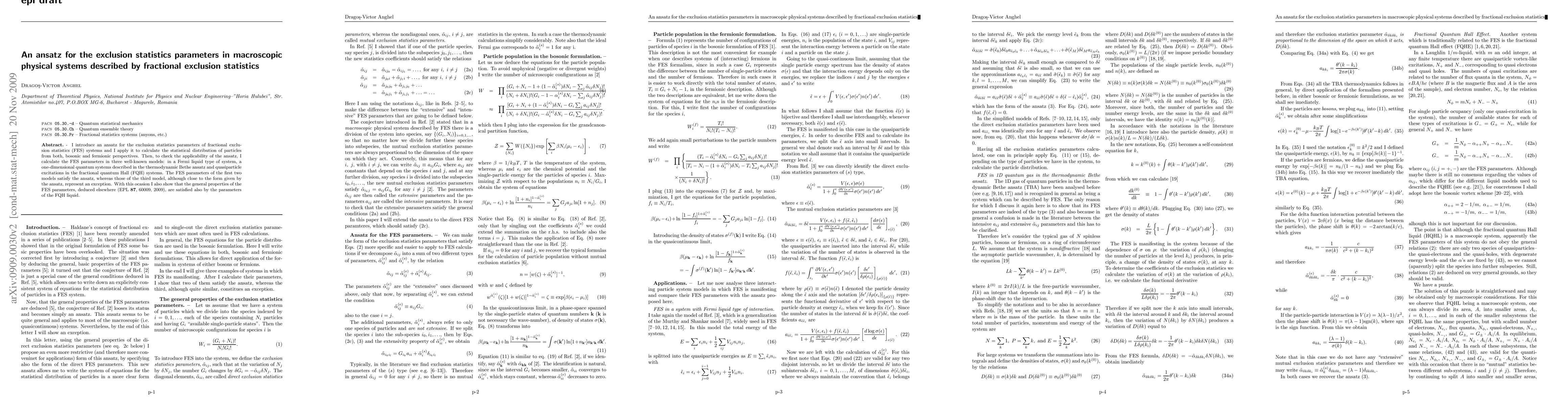 I introduce an ansatz for the exclusion statistics parameters of fractional exclusion statistics (FES) systems and I apply it to calculate the statistical distribution of particles from both, bosonic and fermionic perspectives. Then, to check the applicability of the ansatz, I calculate the FES parameters in three well-known models: in a Fermi liquid type of system, a one-dimensional quantum systems described in the thermodynamic Bethe ansatz and quasiparticle excitations in the fractional quantum Hall (FQH) systems. The FES parameters of the first two models satisfy the ansatz, whereas those of the third model, although close to the form given by the ansatz, represent an exception. With this ocasion I also show that the general properties of the FES parameters, deduced elsewhere (EPL 87, 60009, 2009), are satisfied also by the parameters of the FQH liquid.