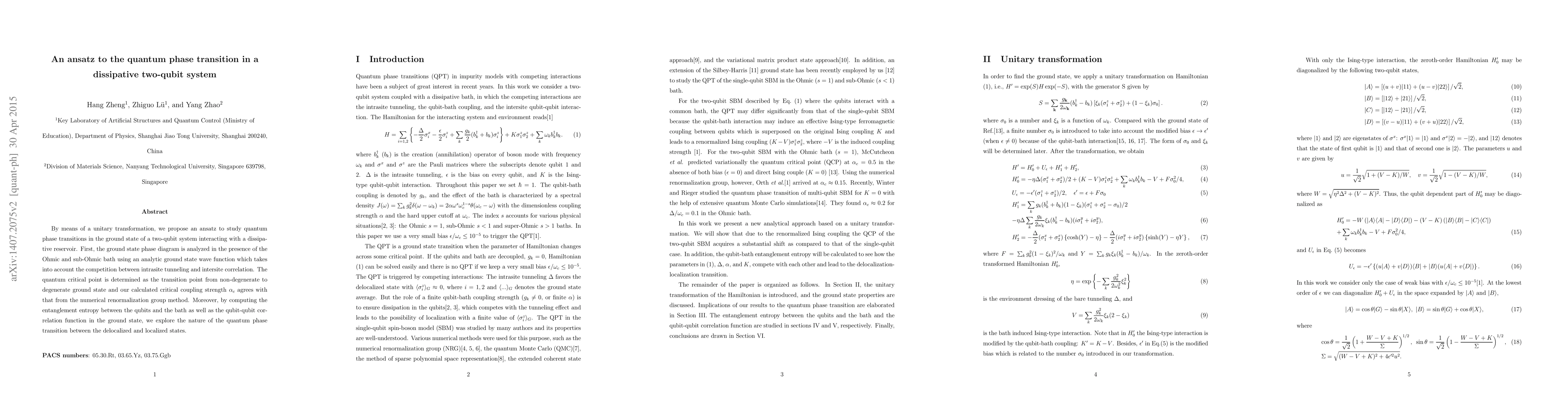 This paper proposes an ansatz using a unitary transformation to study quantum phase transitions in a two-qubit system interacting with a dissipative reservoir. The analysis reveals the critical coupling strength and explores the transition between delocalized and localized states through entanglement entropy and qubit-qubit correlation functions.