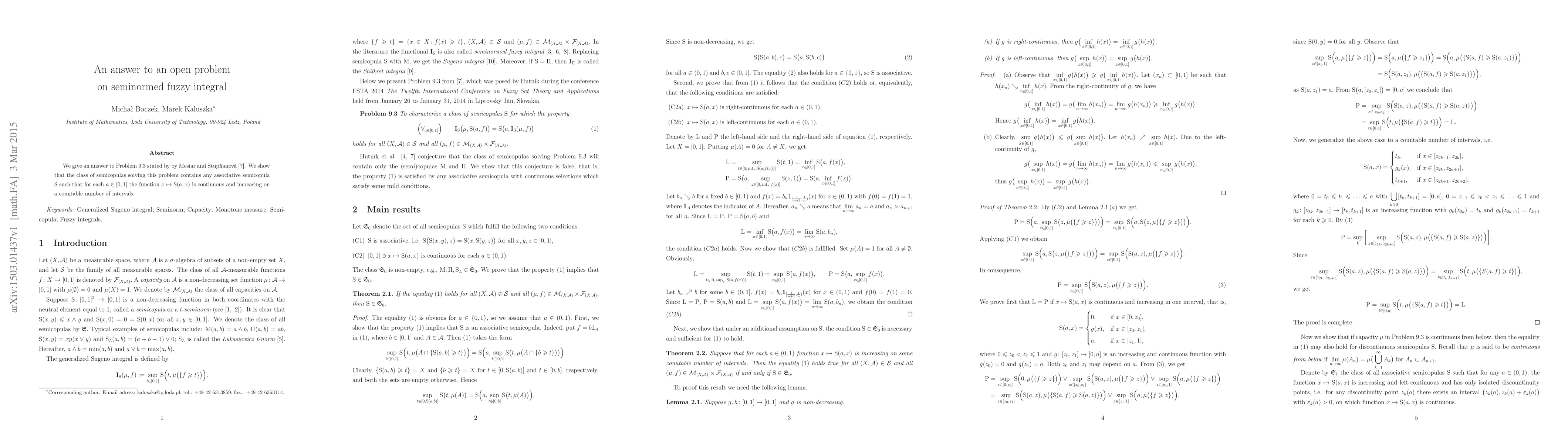 We give an answer to Problem 9.3 stated by by Mesiar and Stupnanova (2015). We show that the class of semicopulas solving this problem contains any associative semicopula S such that a the function S(a,.) is continuous and increasing on a countable number of intervals.