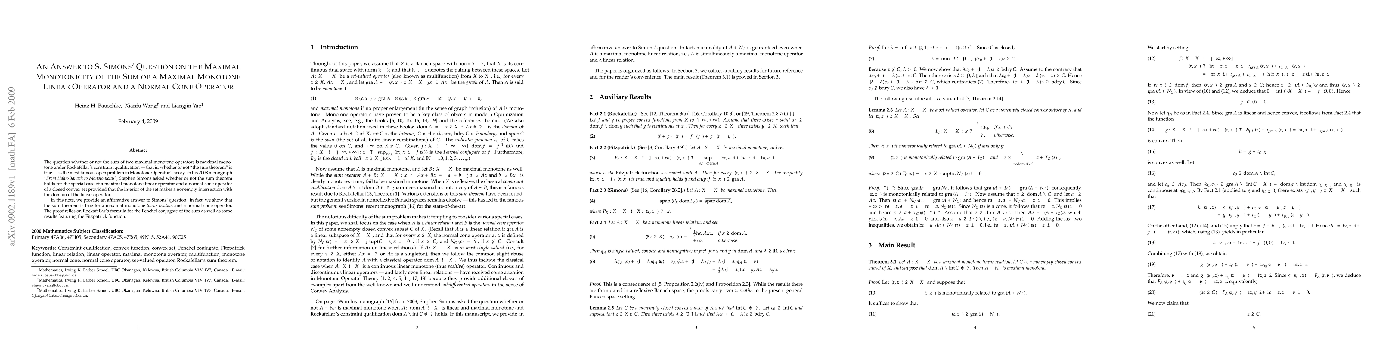 This paper confirms that the sum of a maximal monotone linear operator and a normal cone operator remains maximal monotone under Rockafellar's constraint qualification, addressing a longstanding question posed by Stephen Simons. The proof utilizes Rockafellar's formula and results involving the Fitzpatrick function.