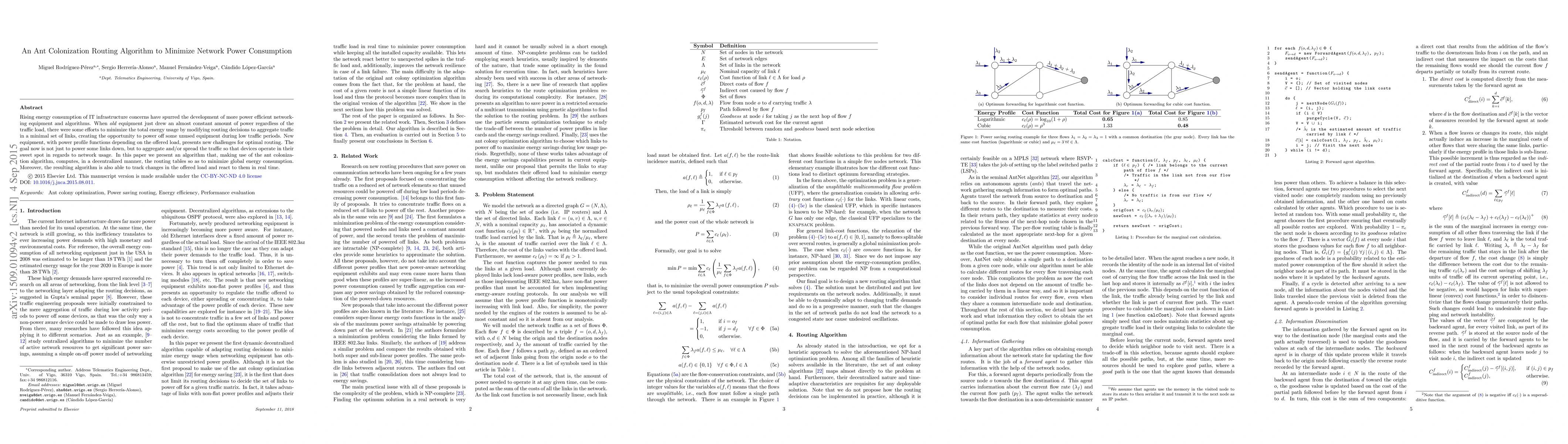 This paper proposes an ant colonization routing algorithm to optimize network power consumption by aggregating traffic to minimize energy usage, especially in modern equipment with variable power profiles. The algorithm computes routing tables in a decentralized manner and dynamically adjusts to changes in traffic load in real time.