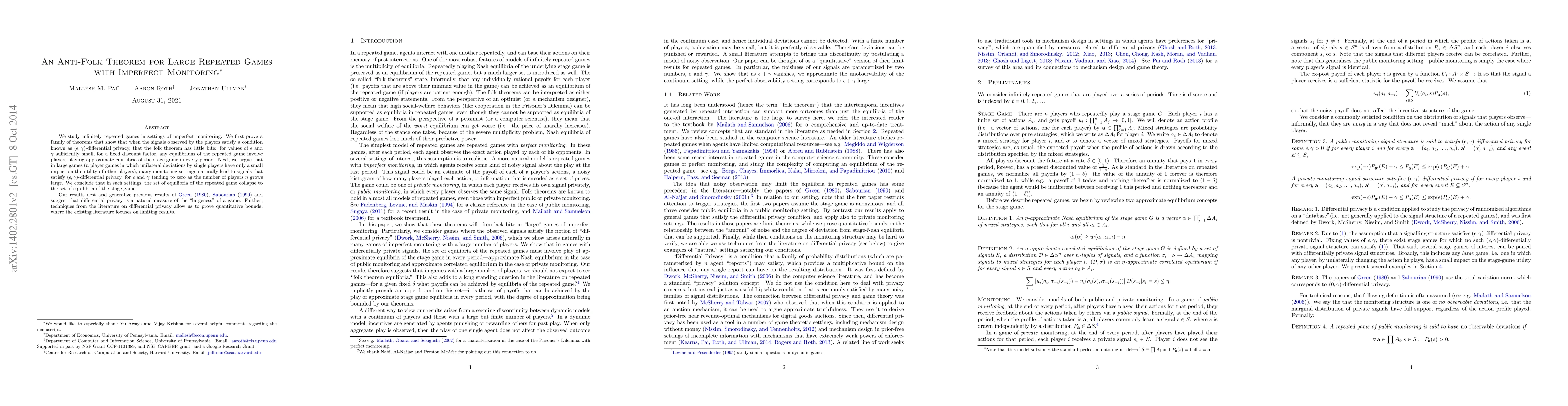We study infinitely repeated games in settings of imperfect monitoring. We first prove a family of theorems that show that when the signals observed by the players satisfy a condition known as $(\epsilon, \gamma)$-differential privacy, that the folk theorem has little bite: for values of $\epsilon$ and $\gamma$ sufficiently small, for a fixed discount factor, any equilibrium of the repeated game involve players playing approximate equilibria of the stage game in every period. Next, we argue that in large games ($n$ player games in which unilateral deviations by single players have only a small impact on the utility of other players), many monitoring settings naturally lead to signals that satisfy $(\epsilon,\gamma)$-differential privacy, for $\epsilon$ and $\gamma$ tending to zero as the number of players $n$ grows large. We conclude that in such settings, the set of equilibria of the repeated game collapse to the set of equilibria of the stage game.