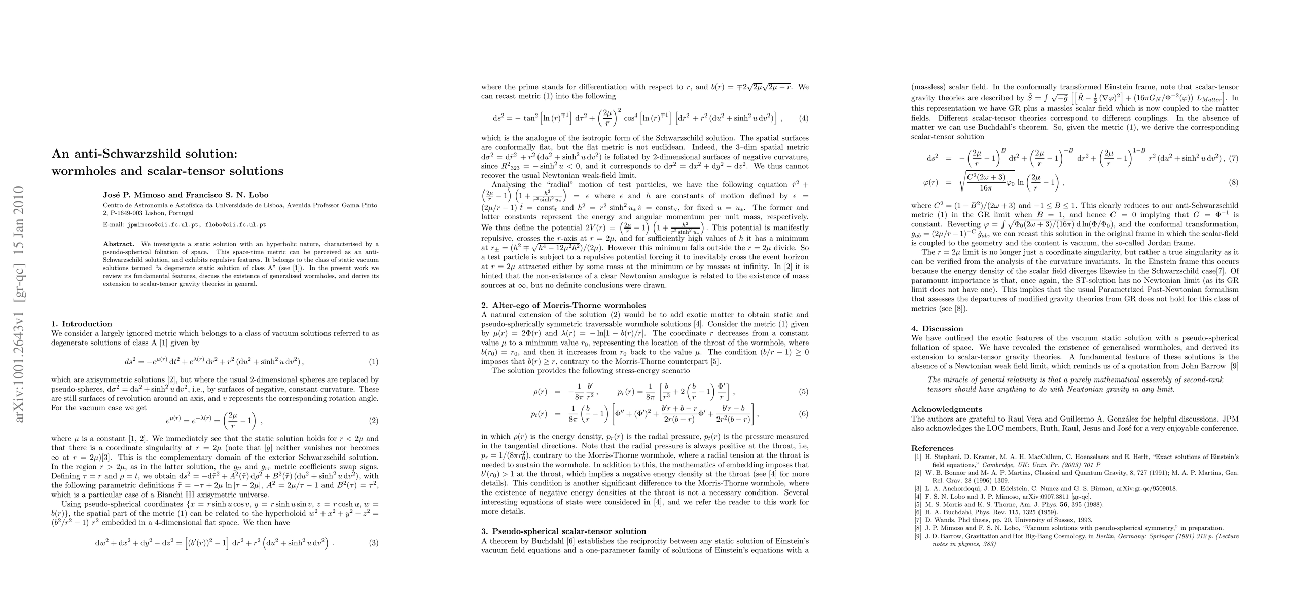 We investigate a static solution with an hyperbolic nature, characterised by a pseudo-spherical foliation of space. This space-time metric can be perceived as an anti-Schwarzschild solution, and exhibits repulsive features. It belongs to the class of static vacuum solutions termed "a degenerate static solution of class A". In the present work we review its fundamental features, discuss the existence of generalised wormholes, and derive its extension to scalar-tensor gravity theories in general.
