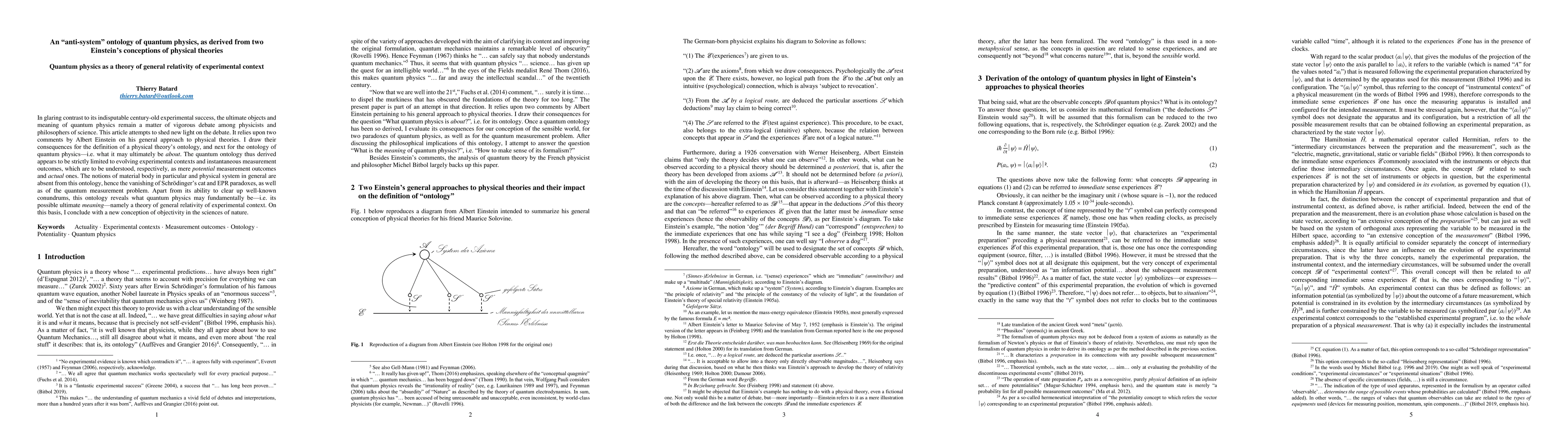 In glaring contrast to its indisputable century-old experimental success, the ultimate objects and meaning of quantum physics remain a matter of vigorous debate among physicists and philosophers of science. This article attempts to shed new light on the debate. It relies upon two comments by Albert Einstein on his general approach to physical theories. I draw their consequences for the definition of a physical theory's ontology, and next for the ontology of quantum physics - i.e. what it may ultimately be about. The quantum ontology thus derived appears to be strictly limited to evolving experimental contexts and instantaneous measurement outcomes, which are to be understood, respectively, as mere potential measurement outcomes and actual ones. The notions of material body in particular and physical system in general are absent from this ontology, hence the vanishing of Schroedinger's cat and EPR paradoxes, as well as of the quantum measurement problem. Apart from its ability to clear up well-known conundrums, this ontology reveals what quantum physics may fundamentally be - i.e. its possible ultimate meaning - namely a theory of general relativity of experimental context. On this basis, I conclude with a new conception of objectivity in the sciences of nature.