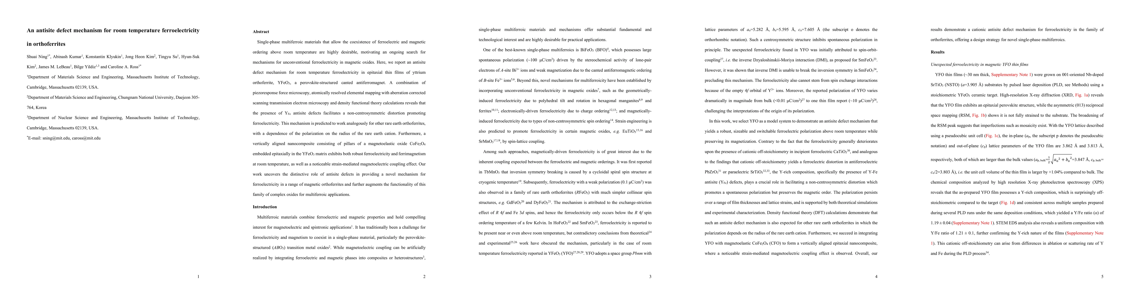 The research identifies an antisite defect mechanism in YFeO3 thin films that induces room temperature ferroelectricity via non-centrosymmetric distortions. This approach also demonstrates magnetoelectric coupling in nanocomposites combining YFeO3 and CoFe2O4, suggesting a broad applicability for multiferroic applications.