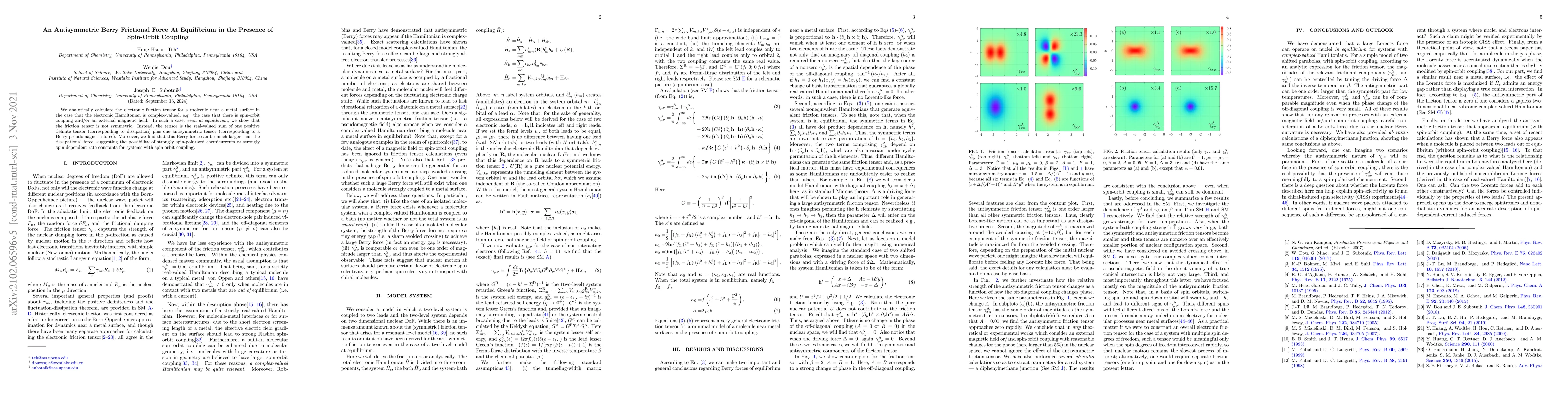 We analytically calculate the electronic friction tensor for a molecule near a metal surface in the case that the electronic Hamiltonian is complex-valued, e.g. the case that there is spin-orbit coupling and/or an external magnetic field. In such a case, even at equilibrium, we show that the friction tensor is not symmetric. Instead, the tensor is the real-valued sum of one positive definite tensor (corresponding to dissipation) plus one antisymmetric tensor (corresponding to a Berry pseudomagnetic force). Moreover, we find that this Berry force can be much larger than the dissipational force, suggesting the possibility of strongly spin-polarized chemicurrents or strongly spin-dependent rate constants for systems with spin-orbit coupling.