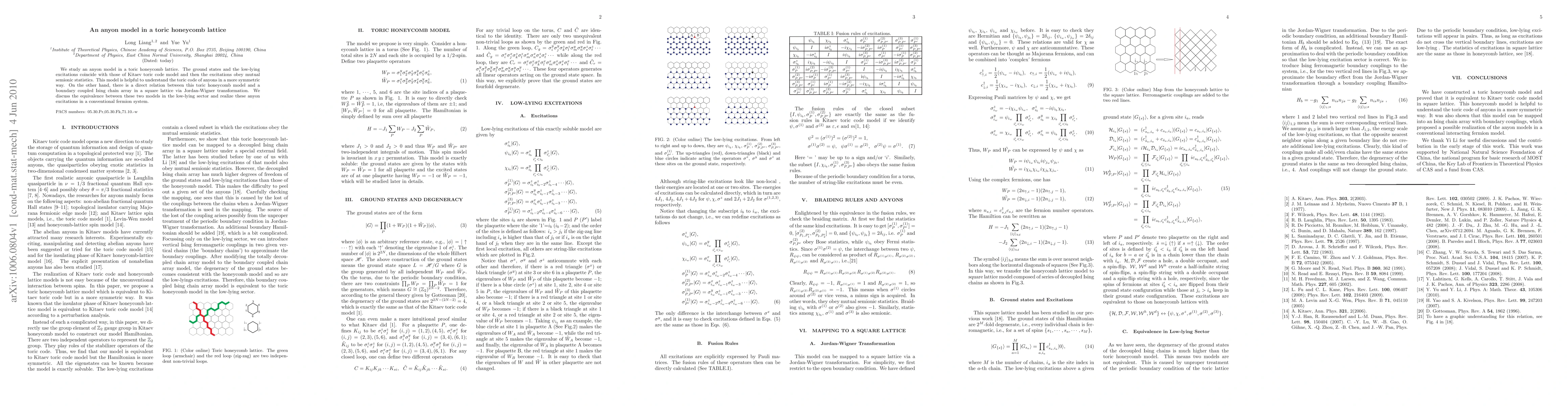 This paper explores an anyon model in a toric honeycomb lattice, demonstrating equivalence with the Kitaev toric code model and revealing mutual semionic statistics in low-lying excitations. It also establishes a connection between this model and a boundary coupled Ising chain array via Jordan-Wigner transformation, highlighting their equivalence in the low-lying sector.