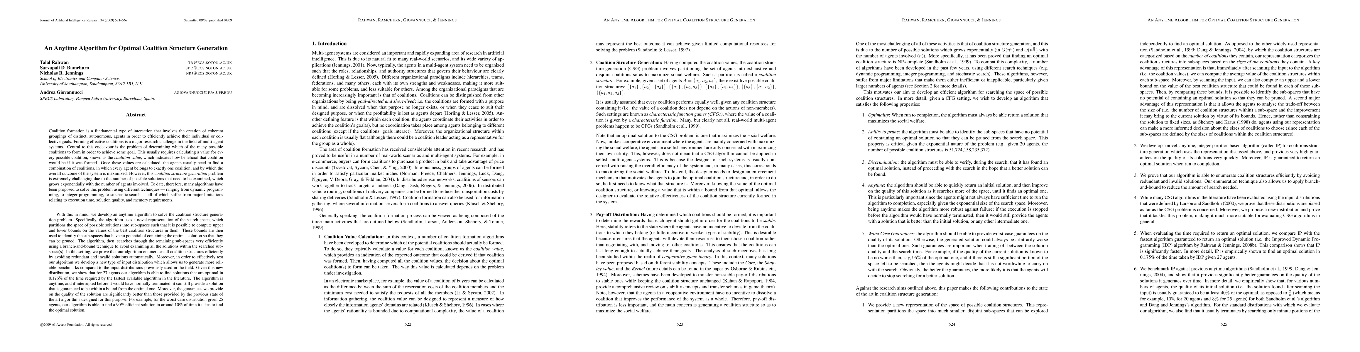 Coalition formation is a fundamental type of interaction that involves the creation of coherent groupings of distinct, autonomous, agents in order to efficiently achieve their individual or collective goals. Forming effective coalitions is a major research challenge in the field of multi-agent systems. Central to this endeavour is the problem of determining which of the many possible coalitions to form in order to achieve some goal. This usually requires calculating a value for every possible coalition, known as the coalition value, which indicates how beneficial that coalition would be if it was formed. Once these values are calculated, the agents usually need to find a combination of coalitions, in which every agent belongs to exactly one coalition, and by which the overall outcome of the system is maximized. However, this coalition structure generation problem is extremely challenging due to the number of possible solutions that need to be examined, which grows exponentially with the number of agents involved. To date, therefore, many algorithms have been proposed to solve this problem using different techniques ranging from dynamic programming, to integer programming, to stochastic search all of which suffer from major limitations relating to execution time, solution quality, and memory requirements. With this in mind, we develop an anytime algorithm to solve the coalition structure generation problem. Specifically, the algorithm uses a novel representation of the search space, which partitions the space of possible solutions into sub-spaces such that it is possible to compute upper and lower bounds on the values of the best coalition structures in them. These bounds are then used to identify the sub-spaces that have no potential of containing the optimal solution so that they can be pruned. The algorithm, then, searches through the remaining sub-spaces very efficiently using a branch-and-bound technique to avoid examining all the solutions within the searched subspace(s). In this setting, we prove that our algorithm enumerates all coalition structures efficiently by avoiding redundant and invalid solutions automatically. Moreover, in order to effectively test our algorithm we develop a new type of input distribution which allows us to generate more reliable benchmarks compared to the input distributions previously used in the field. Given this new distribution, we show that for 27 agents our algorithm is able to find solutions that are optimal in 0.175% of the time required by the fastest available algorithm in the literature. The algorithm is anytime, and if interrupted before it would have normally terminated, it can still provide a solution that is guaranteed to be within a bound from the optimal one. Moreover, the guarantees we provide on the quality of the solution are significantly better than those provided by the previous state of the art algorithms designed for this purpose. For example, for the worst case distribution given 25 agents, our algorithm is able to find a 90% efficient solution in around 10% of time it takes to find the optimal solution.