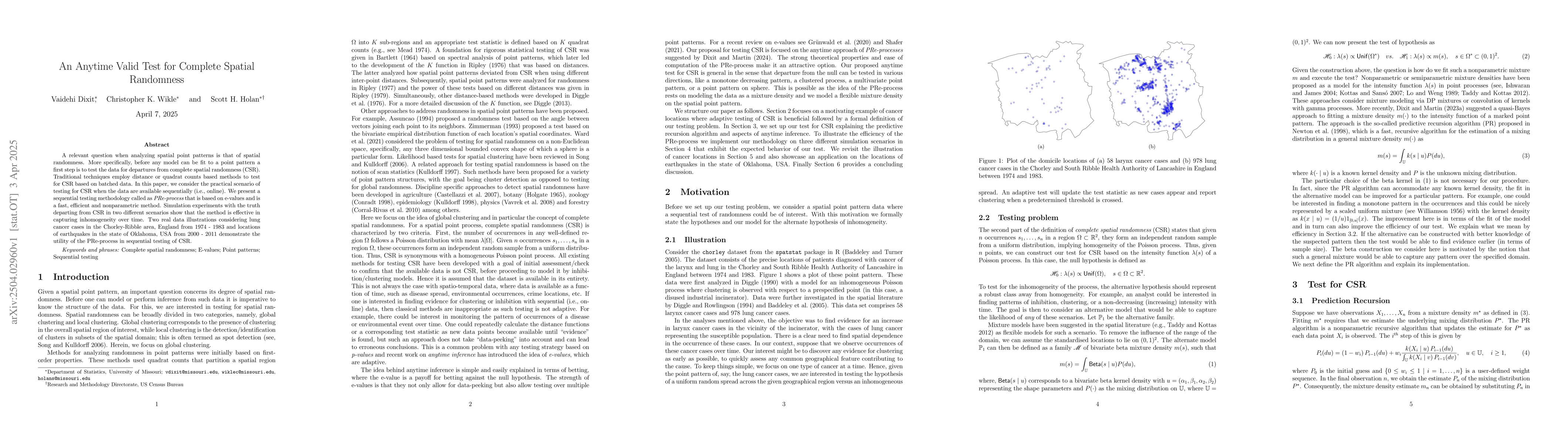 The paper presents a sequential testing methodology called PRe-process based on e-values for testing complete spatial randomness (CSR) with sequentially available data, which is a nonparametric and efficient approach.