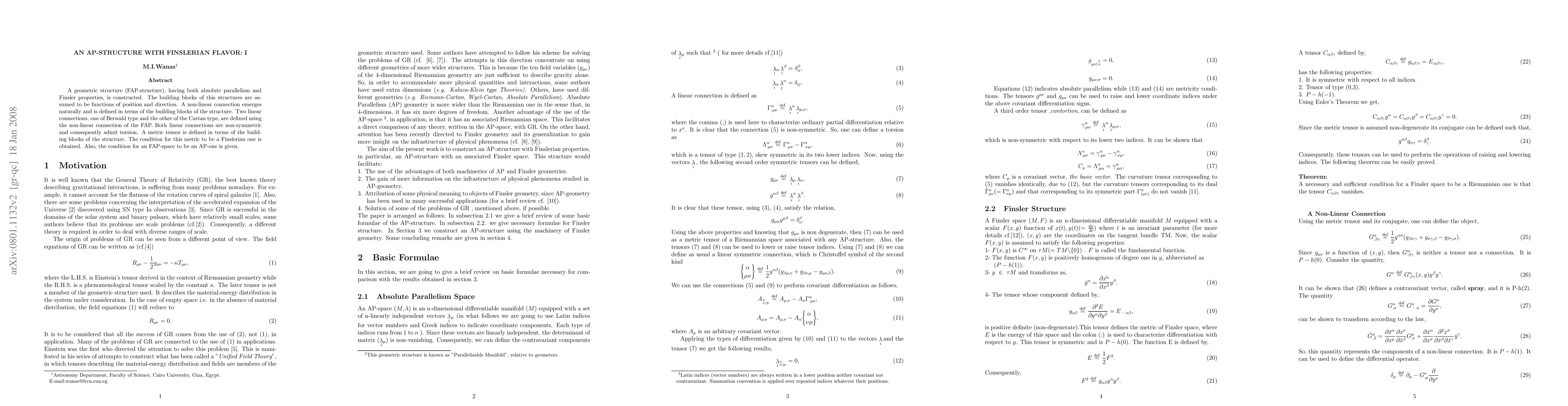 This research introduces a new geometric structure, FAP-structure, combining absolute parallelism and Finsler properties. It defines non-linear and linear connections, a metric tensor, and conditions for Finslerian and AP-spaces.
