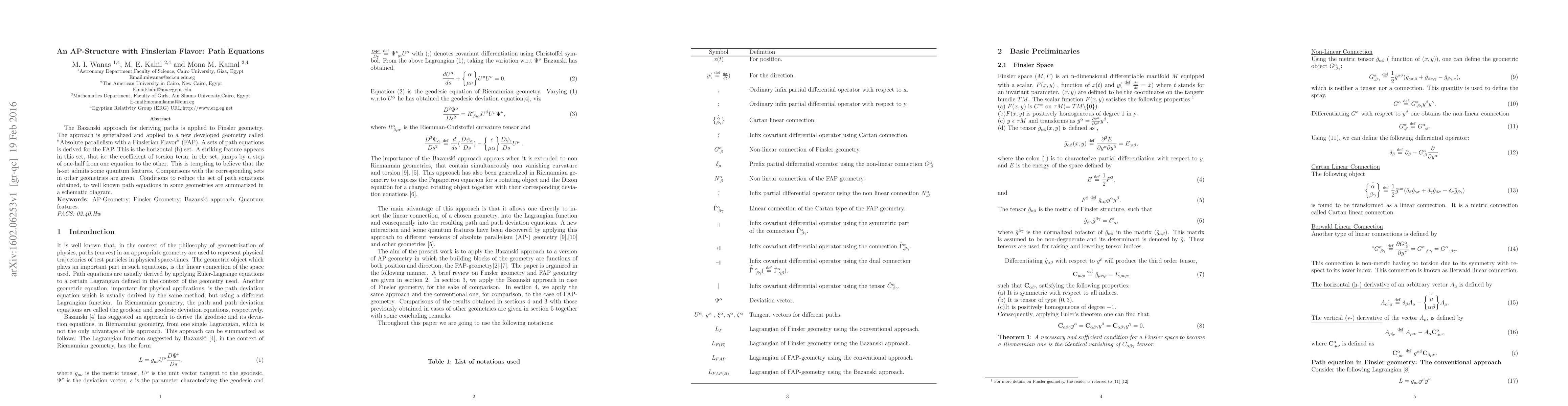 The Bazanski approach for deriving paths is applied to Finsler geometry. The approach is generalized and applied to a new developed geometry called "Absolute parallelism with a Finslerian Flavor" (FAP). A sets of path equations is derived for the FAP. This is the horizontal (h) set. A striking feature appears in this set, that is: the coefficient of torsion term, in the set, jumps by a step of one-half from one equation to the other. This is tempting to believe that the h-set admits some quantum features. Comparisons with the corresponding sets in other geometries are given. Conditions to reduce the set of path equations obtained, to well known path equations in some geometries are summarized in a schematic diagram.