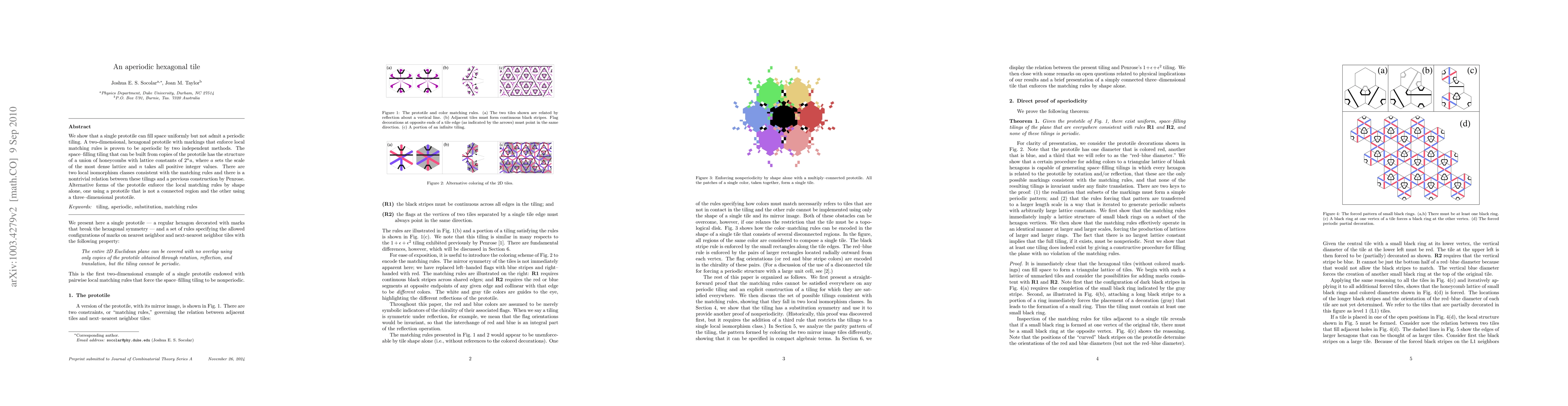 We show that a single prototile can fill space uniformly but not admit a periodic tiling. A two-dimensional, hexagonal prototile with markings that enforce local matching rules is proven to be aperiodic by two independent methods. The space--filling tiling that can be built from copies of the prototile has the structure of a union of honeycombs with lattice constants of $2^n a$, where $a$ sets the scale of the most dense lattice and $n$ takes all positive integer values. There are two local isomorphism classes consistent with the matching rules and there is a nontrivial relation between these tilings and a previous construction by Penrose. Alternative forms of the prototile enforce the local matching rules by shape alone, one using a prototile that is not a connected region and the other using a three--dimensional prototile.
