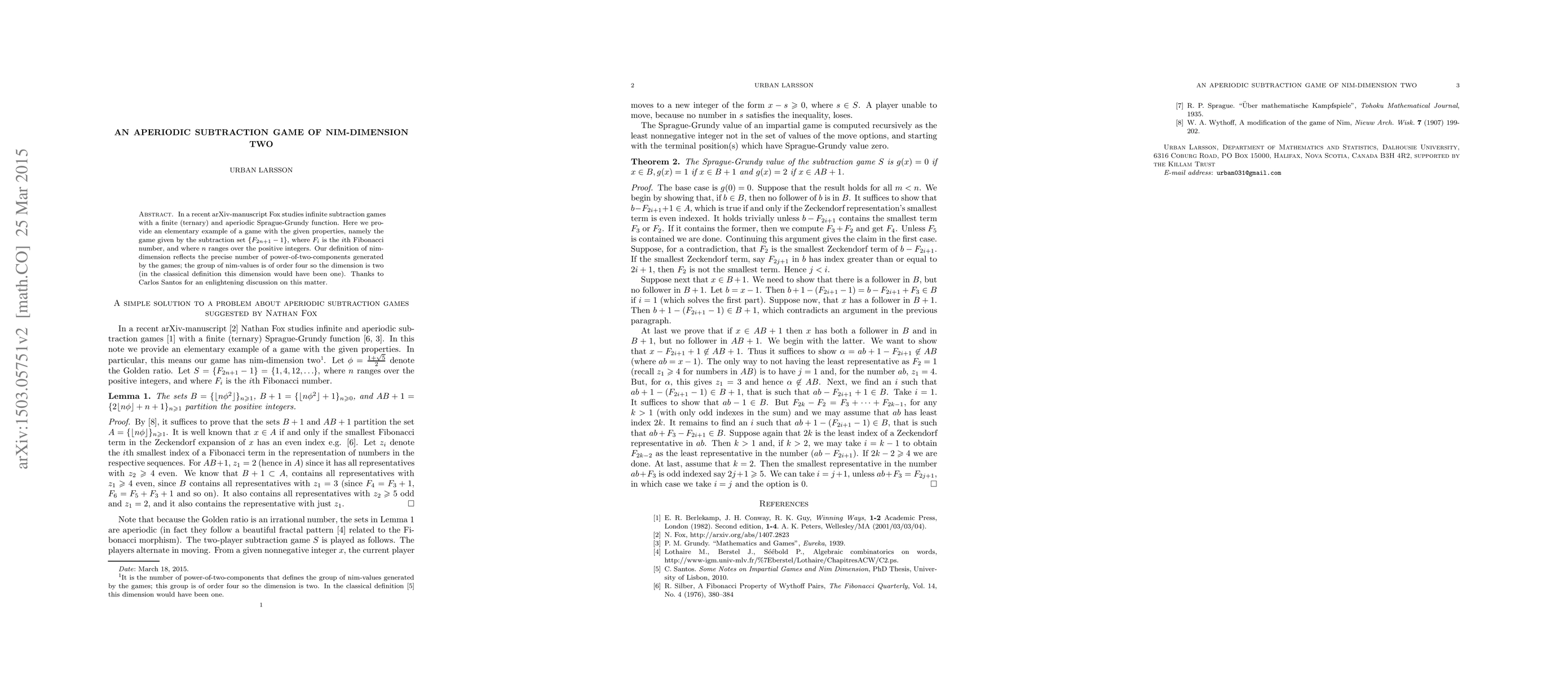 In a recent arXiv-manuscript Fox studies infinite subtraction games with a finite (ternary) and aperiodic Sprague-Grundy function. Here we provide an elementary example of a game with the given properties, namely the game given by the subtraction set $\{F_{2n+1}-1\}$, where $F_i$ is the $i$th Fibonacci number, and where $n$ ranges over the positive integers. Our definition of nim-dimension reflects the precise number of power-of-two-components generated by the games; the group of nim-values is of order four so the dimension is two (in the classical definition this dimension would have been one). Thanks to Carlos Santos for an enlightening discussion on this matter.