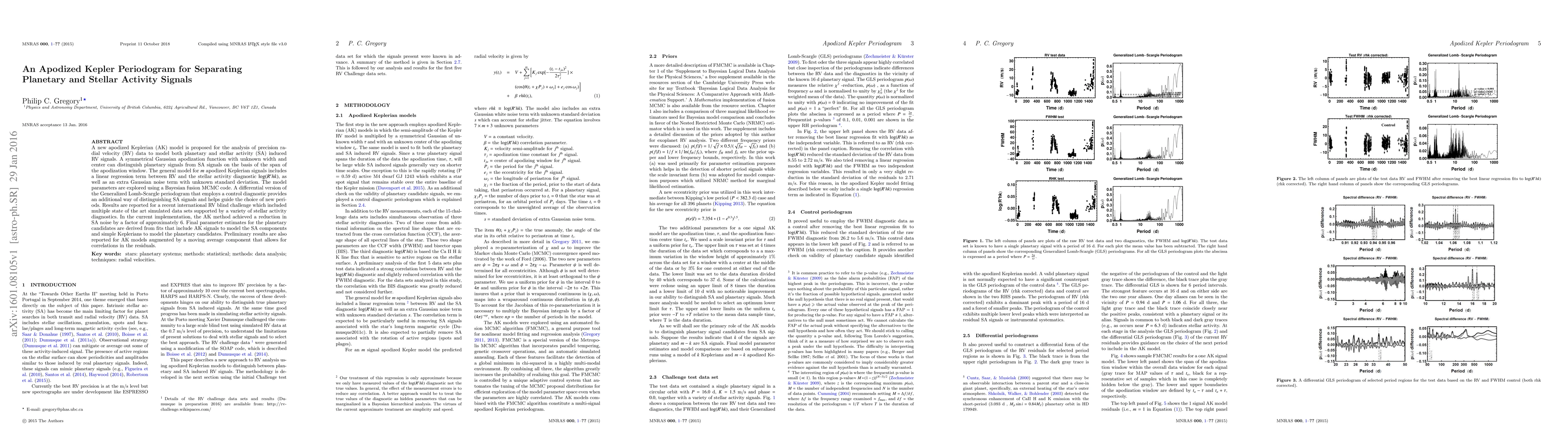 This paper proposes an apodized Keplerian (AK) model for analyzing radial velocity data to distinguish planetary signals from stellar activity. The model employs a Gaussian apodization function and Bayesian MCMC methods to reduce stellar activity noise, achieving a 6-fold reduction in noise. Preliminary results also suggest enhanced performance with an augmented model incorporating a moving average component.