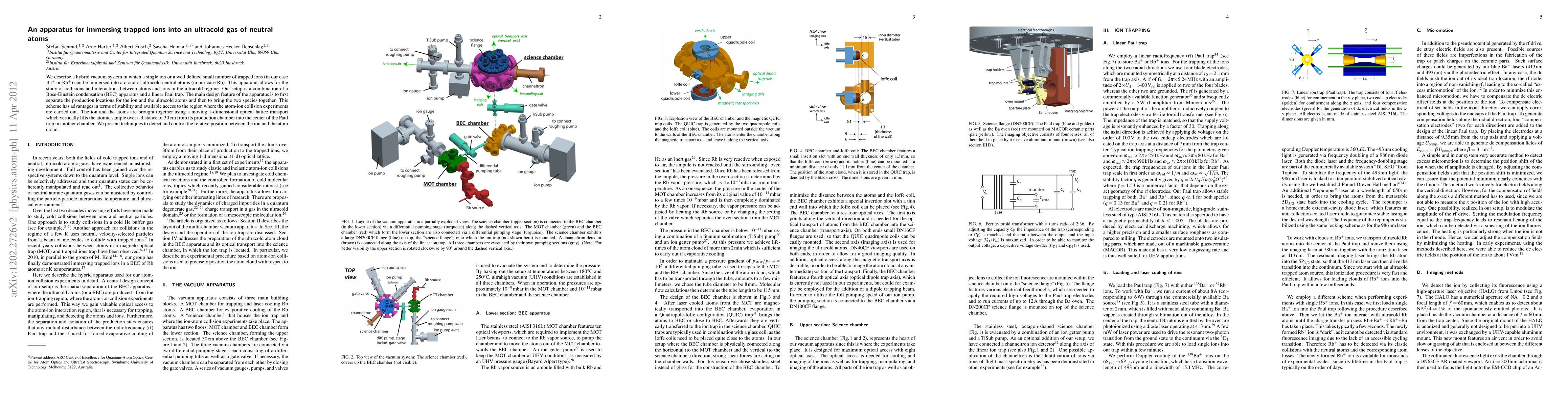 This paper presents a hybrid vacuum system combining a Bose-Einstein condensation apparatus and a linear Paul trap to immerse trapped ions in an ultracold gas of neutral atoms, enabling studies of atom-ion interactions. The apparatus uses a moving optical lattice to transport the atom cloud to the ion trap, with techniques for detecting and controlling their relative positions.