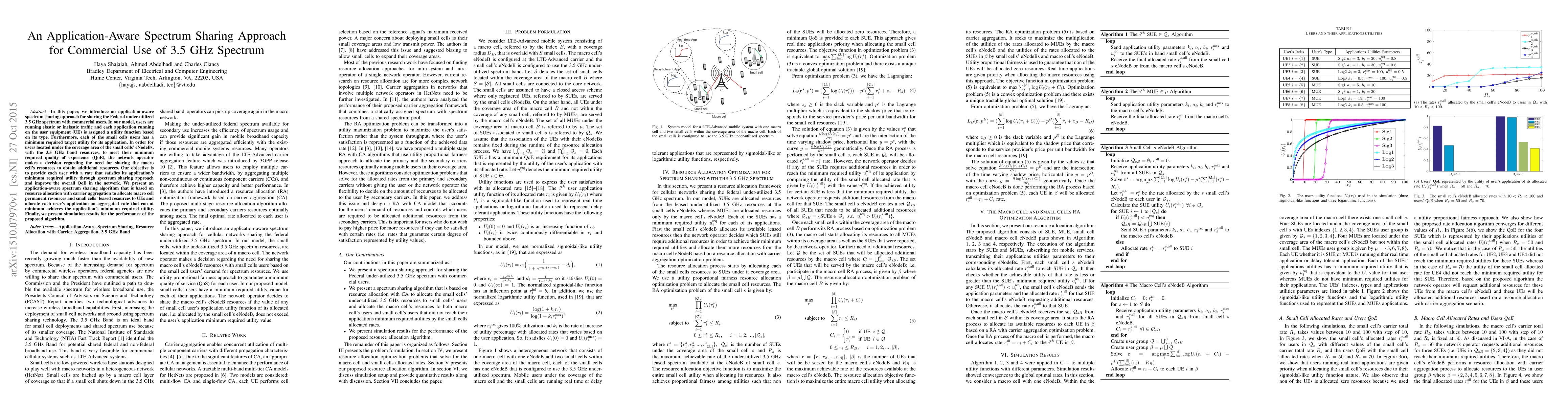In this paper, we introduce an application-aware spectrum sharing approach for sharing the Federal under-utilized 3.5 GHz spectrum with commercial users. In our model, users are running elastic or inelastic traffic and each application running on the user equipment (UE) is assigned a utility function based on its type. Furthermore, each of the small cells users has a minimum required target utility for its application. In order for users located under the coverage area of the small cells' eNodeBs, with the 3.5 GHz band resources, to meet their minimum required quality of experience (QoE), the network operator makes a decision regarding the need for sharing the macro cell's resources to obtain additional resources. Our objective is to provide each user with a rate that satisfies its application's minimum required utility through spectrum sharing approach and improve the overall QoE in the network. We present an application-aware spectrum sharing algorithm that is based on resource allocation with carrier aggregation to allocate macro cell permanent resources and small cells' leased resources to UEs and allocate each user's application an aggregated rate that can at minimum achieves the application's minimum required utility. Finally, we present simulation results for the performance of the proposed algorithm.