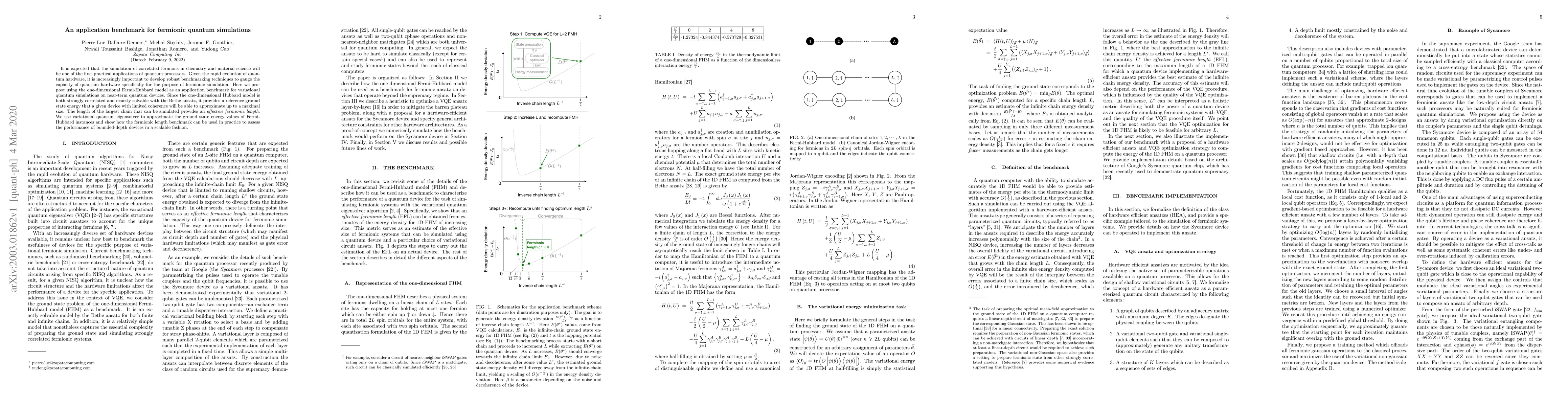 Researchers propose a benchmark for fermionic quantum simulations using the one-dimensional Fermi-Hubbard model, which can help assess the performance of near-term quantum devices. The study aims to bridge the gap between theoretical simulations and practical applications in chemistry and material science.