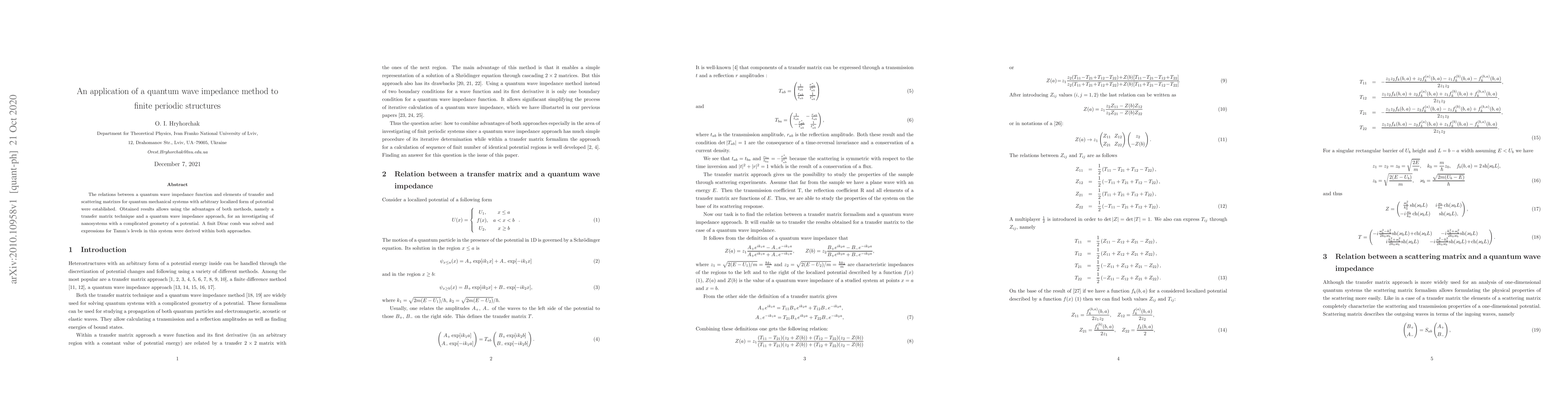 The relations between a quantum wave impedance function and elements of transfer and scattering matrixes for quantum mechanical systems with arbitrary localized form of potential were established. Obtained results allows using the advantages of both methods, namely a transfer matrix technique and a quantum wave impedance approach, for an investigating of nanosystems with a complicated geometry of a potential. A finit Dirac comb was solved and expressions for Tamm's levels in this system were derived within both approaches.