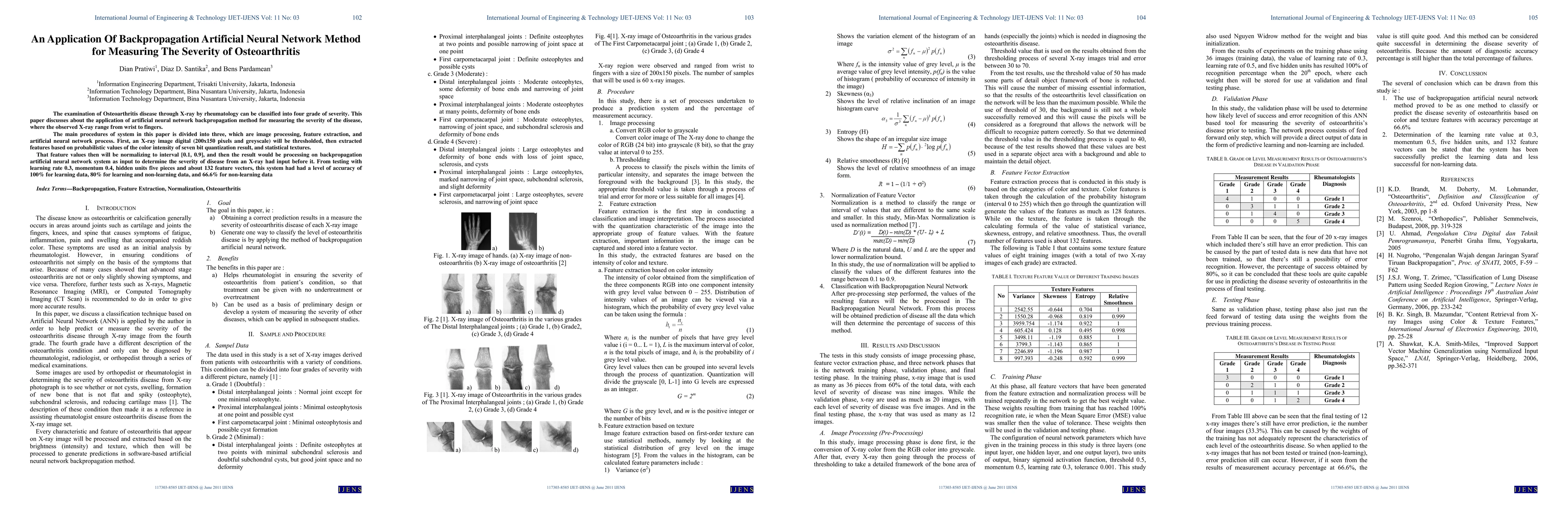 This paper applies a backpropagation artificial neural network to measure the severity of osteoarthritis from X-ray images, involving image processing, feature extraction, and neural network training. The system achieved 100% accuracy on learning data, 80% on combined learning and non-learning data, and 66.6% on non-learning data.