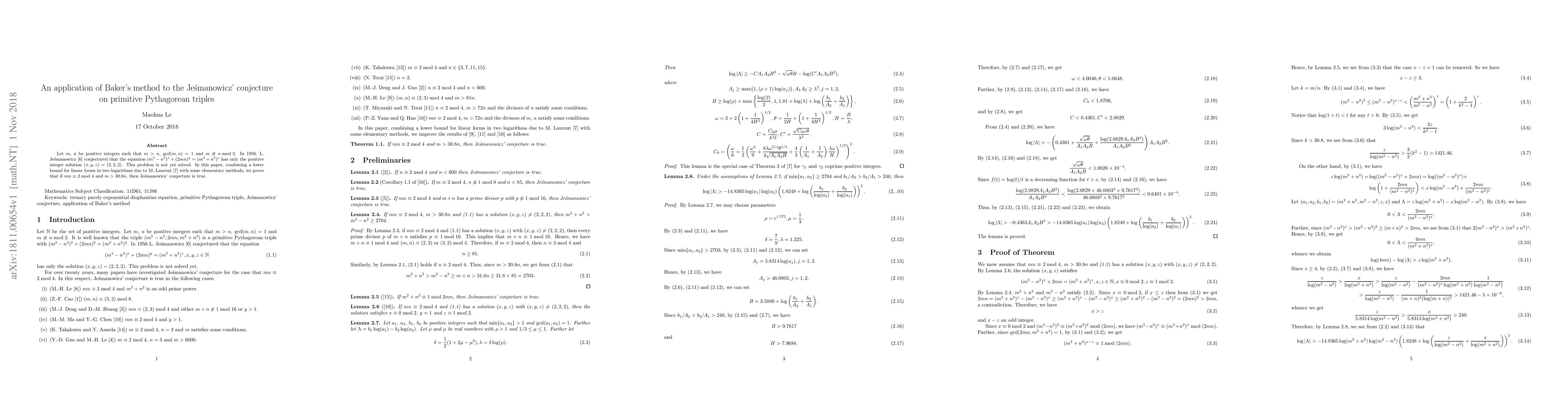 Let $m$, $n$ be positive integers such that $m>n$, $\gcd(m,n)=1$ and $m \not\equiv n \bmod 2$. In 1956, L. Je\'smanowicz \cite{Jes} conjectured that the equation $(m^2 - n^2)^x + (2mn)^y = (m^2+n^2)^z$ has only the positive integer solution $(x,y,z) = (2,2,2)$. This problem is not yet solved. In this paper, combining a lower bound for linear forms in two logarithms due to M. Laurent \cite{Lau} with some elementary methods, we prove that if $mn \equiv 2 \bmod 4$ and $m > 30.8 n$, then Je\'smanowicz' conjecture is true.