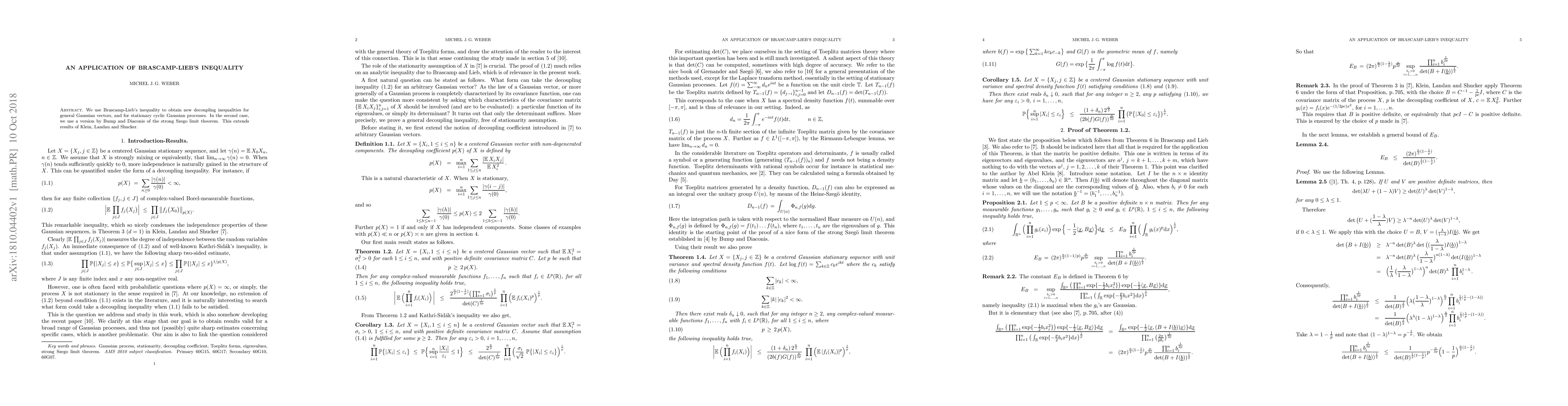 We use Brascamp-Lieb's inequality to obtain new decoupling inequalities for general Gaussian vectors, and for stationary cyclic Gaussian processes. In the second case, we use a version by Bump and Diaconis of the strong Szego limit theorem. This extends results of Klein, Landau and Shucker.