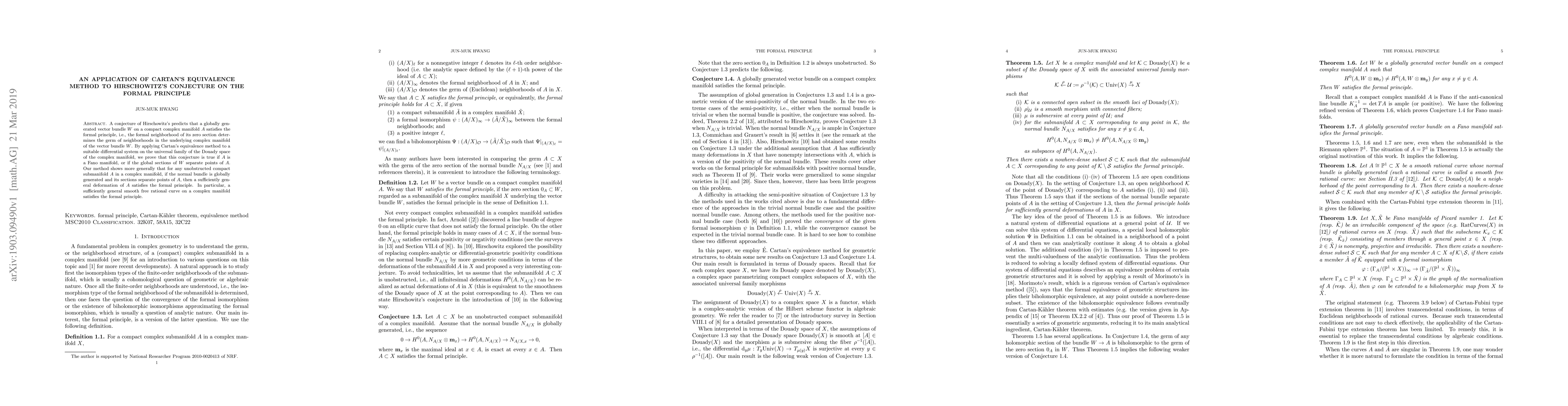 A conjecture of Hirschowitz's predicts that a globally generated vector bundle $W$ on a compact complex manifold $A$ satisfies the formal principle, i.e., the formal neighborhood of its zero section determines the germ of neighborhoods in the underlying complex manifold of the vector bundle $W$. By applying Cartan's equivalence method to a suitable differential system on the universal family of the Douady space of the complex manifold, we prove that this conjecture is true if $A$ is a Fano manifold, or if the global sections of $W$ separate points of $A$. Our method shows more generally that for any unobstructed compact submanifold $A$ in a complex manifold, if the normal bundle is globally generated and its sections separate points of $A$, then a sufficiently general deformation of $A$ satisfies the formal principle. In particular, a sufficiently general smooth free rational curve on a complex manifold satisfies the formal principle.