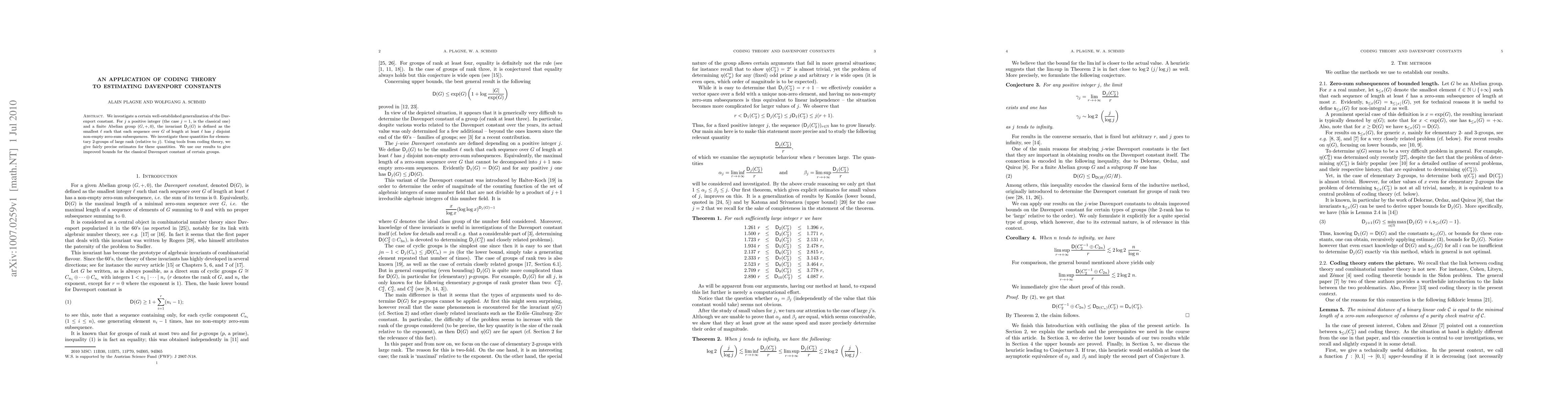 We investigate a certain well-established generalization of the Davenport constant. For $j$ a positive integer (the case $j=1$, is the classical one) and a finite Abelian group $(G,+,0)$, the invariant $\Dav_j(G)$ is defined as the smallest $\ell$ such that each sequence over $G$ of length at least $\ell$ has $j$ disjoint non-empty zero-sum subsequences. We investigate these quantities for elementary $2$-groups of large rank (relative to $j$). Using tools from coding theory, we give fairly precise estimates for these quantities. We use our results to give improved bounds for the classical Davenport constant of certain groups.