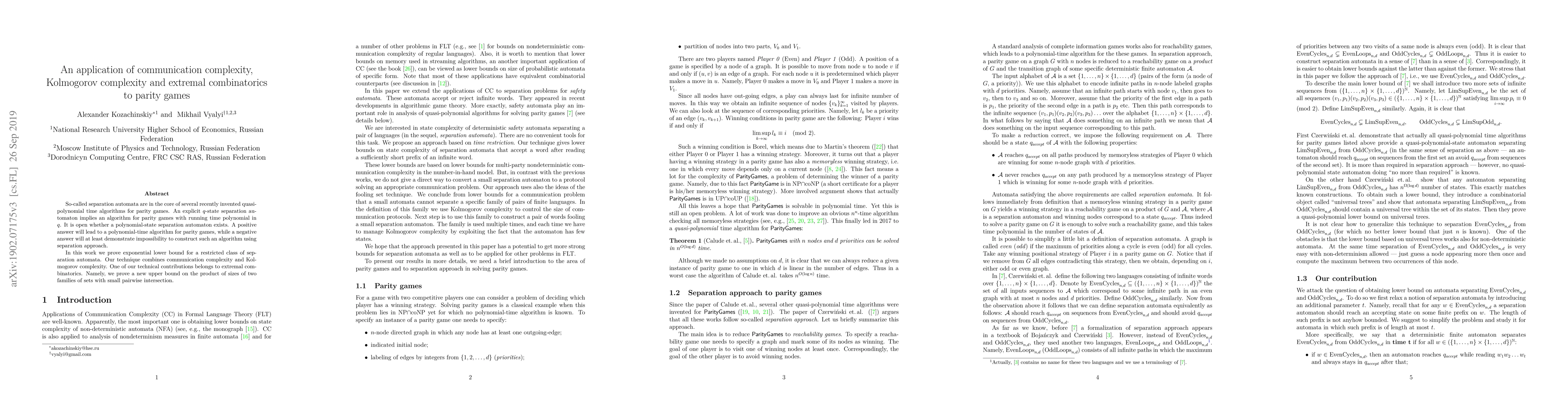 So-called separation automata are in the core of several recently invented quasi-polynomial time algorithms for parity games. An explicit $q$-state separation automaton implies an algorithm for parity games with running time polynomial in $q$. It is open whether a polynomial-state separation automaton exists. A positive answer will lead to a polynomial-time algorithm for parity games, while a negative answer will at least demonstrate impossibility to construct such an algorithm using separation approach. In this work we prove exponential lower bound for a restricted class of separation automata. Our technique combines communication complexity and Kolmogorov complexity. One of our technical contributions belongs to extremal combinatorics. Namely, we prove a new upper bound on the product of sizes of two families of sets with small pairwise intersection.