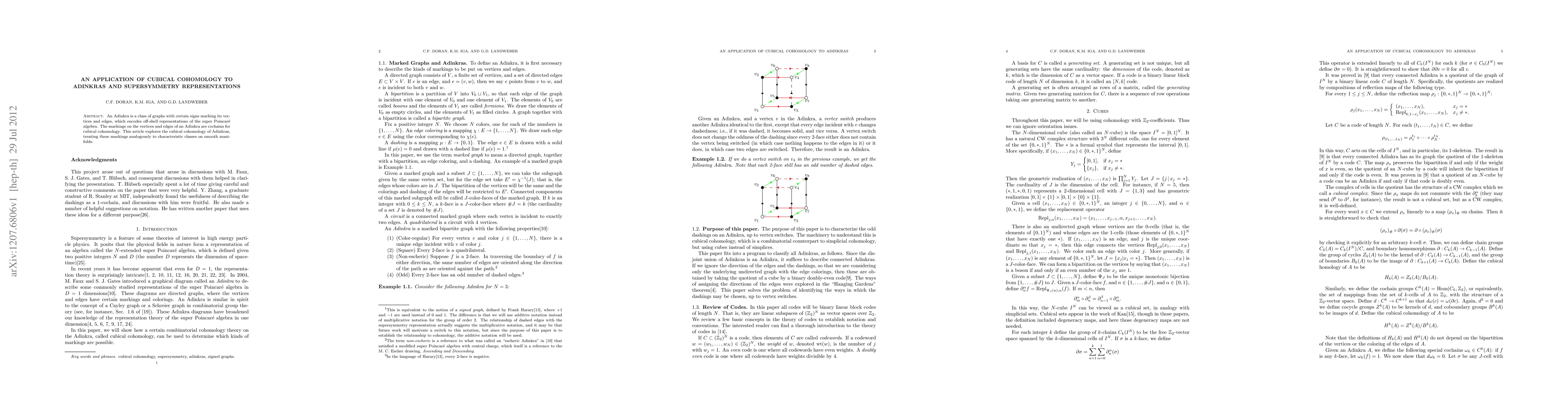 This paper explores the connection between Adinkras and cubical cohomology, finding that markings on Adinkra vertices and edges can represent supersymmetric representations of the super Poincaré algebra.