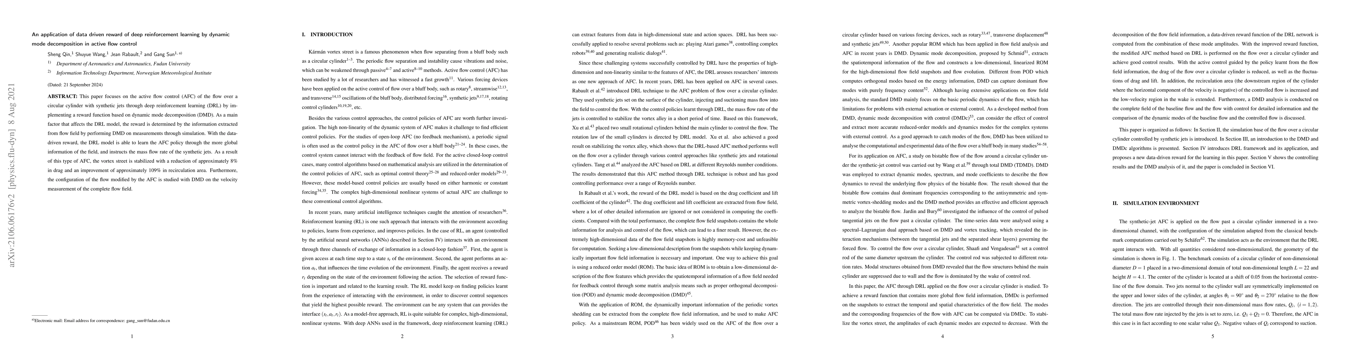 This paper applies deep reinforcement learning (DRL) with a data-driven reward function based on dynamic mode decomposition (DMD) for active flow control over a circular cylinder using synthetic jets. The DRL model stabilizes the vortex street, reducing drag by 8% and improving the recirculation area by 109%.