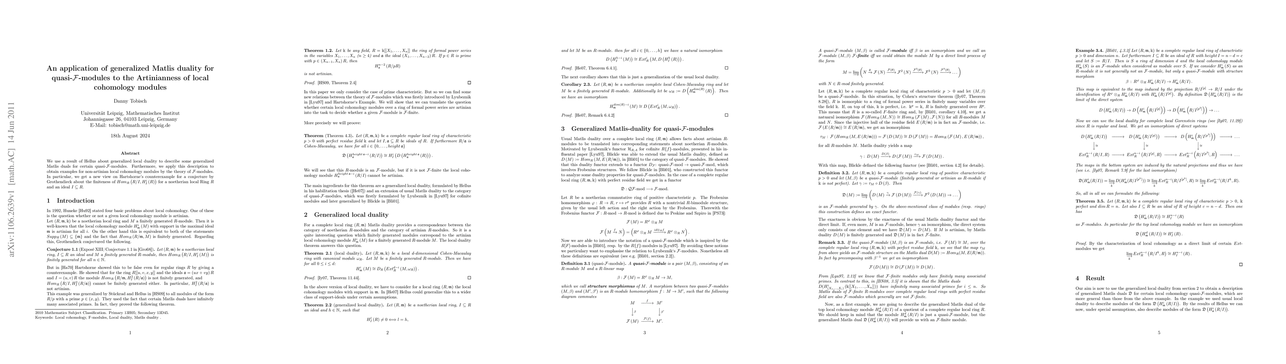 This paper utilizes generalized Matlis duality for quasi-\F-modules, informed by Hellus' local duality result, to investigate the Artinianness of local cohomology modules. It reveals non-Artinian local cohomology examples, offering fresh insight into Hartshorne's counterexample to Grothendieck's conjecture on the finiteness of certain homological maps.