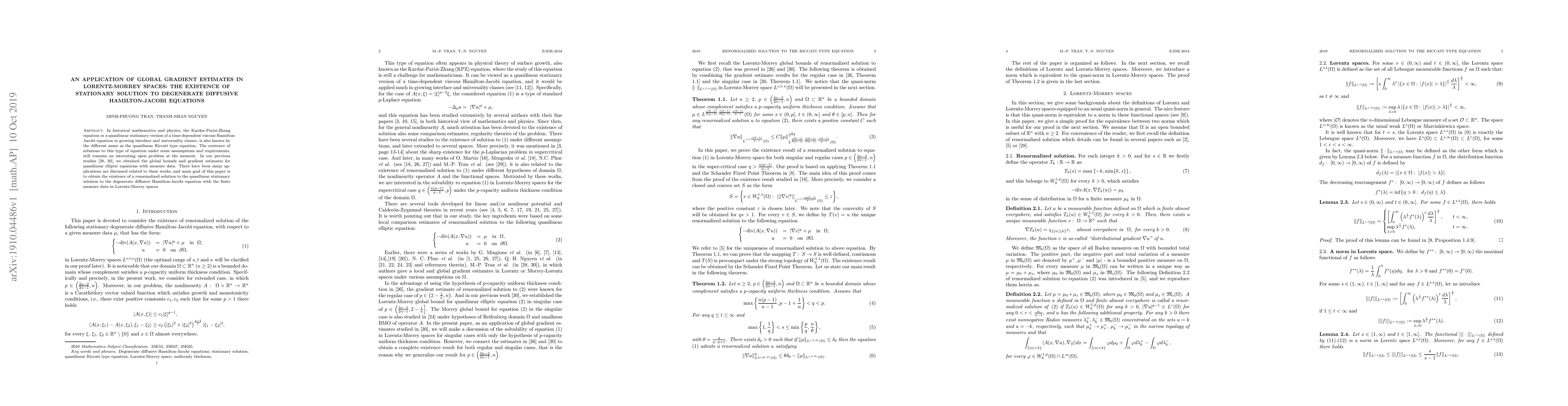 This paper investigates the existence of a renormalized solution to the quasilinear stationary degenerate diffusive Hamilton-Jacobi equation using global gradient estimates in Lorentz-Morrey spaces, extending previous results on quasilinear elliptic equations with measure data. The focus is on addressing an open problem regarding the solutions to this type of equation.