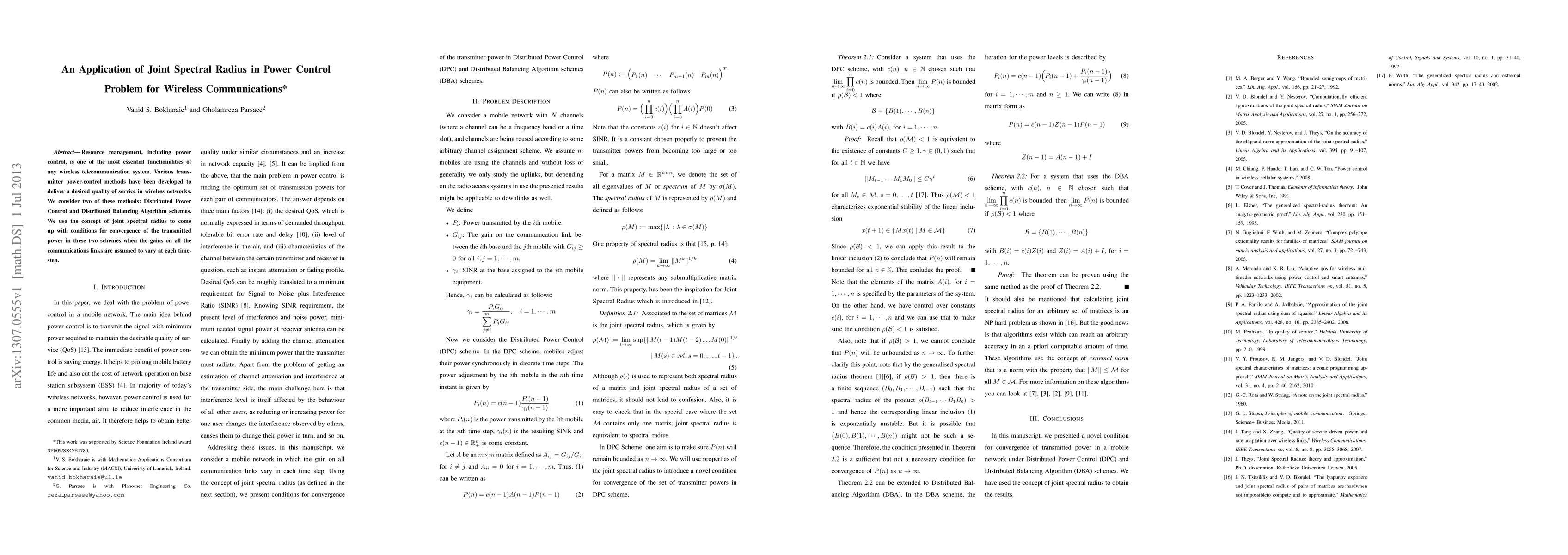 This paper applies joint spectral radius to analyze the convergence conditions for two power control methods—Distributed Power Control and Distributed Balancing Algorithm—in wireless communication networks, where link gains vary over time. The study aims to ensure desired service quality through effective power management.