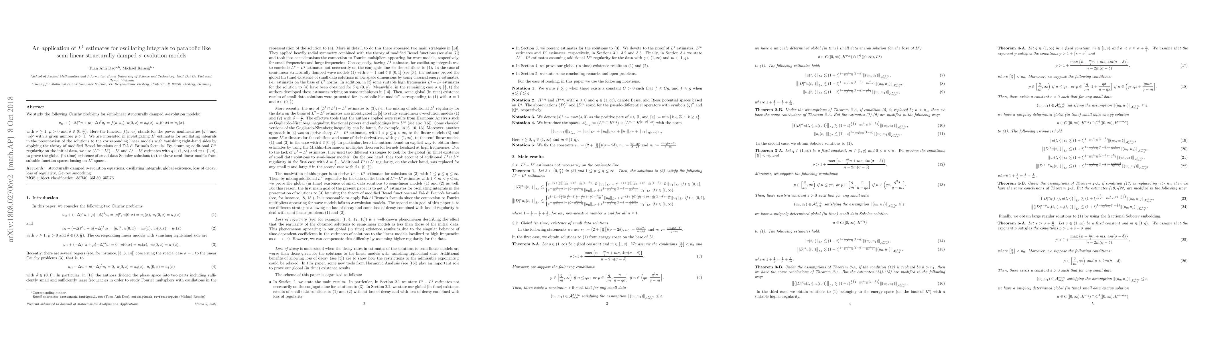 This paper investigates $L^1$ estimates for oscillating integrals in semi-linear structurally damped $\sigma$-evolution models, applying $L^q$ estimates and modified Bessel functions to prove global existence of small data solutions under suitable initial conditions.