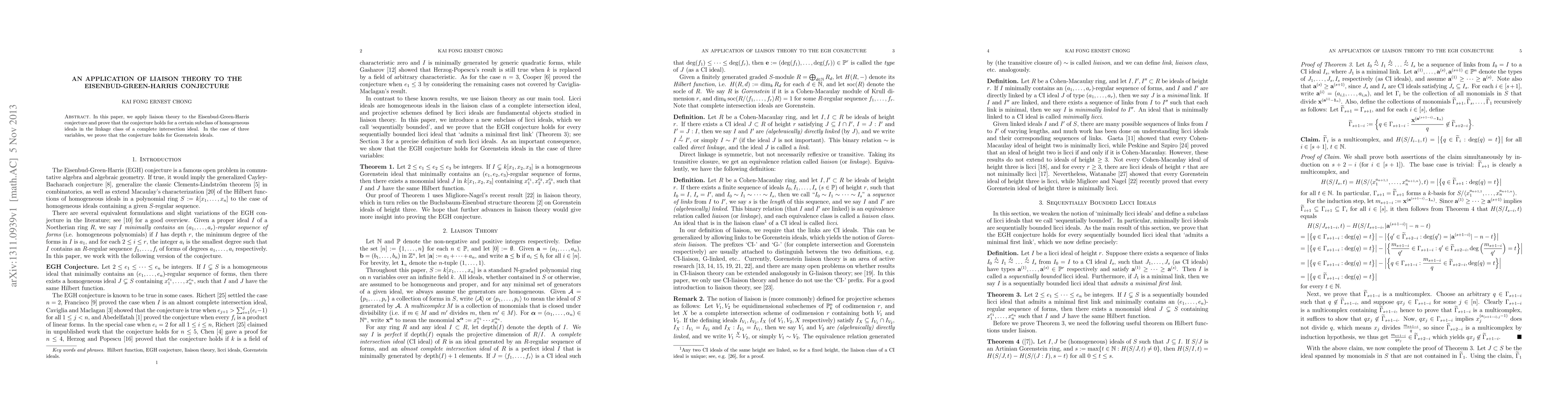 In this paper, we apply liaison theory to the Eisenbud-Green-Harris conjecture and prove that the conjecture holds for a certain subclass of homogeneous ideals in the linkage class of a complete intersection ideal. In the case of three variables, we prove that the conjecture holds for Gorenstein ideals.