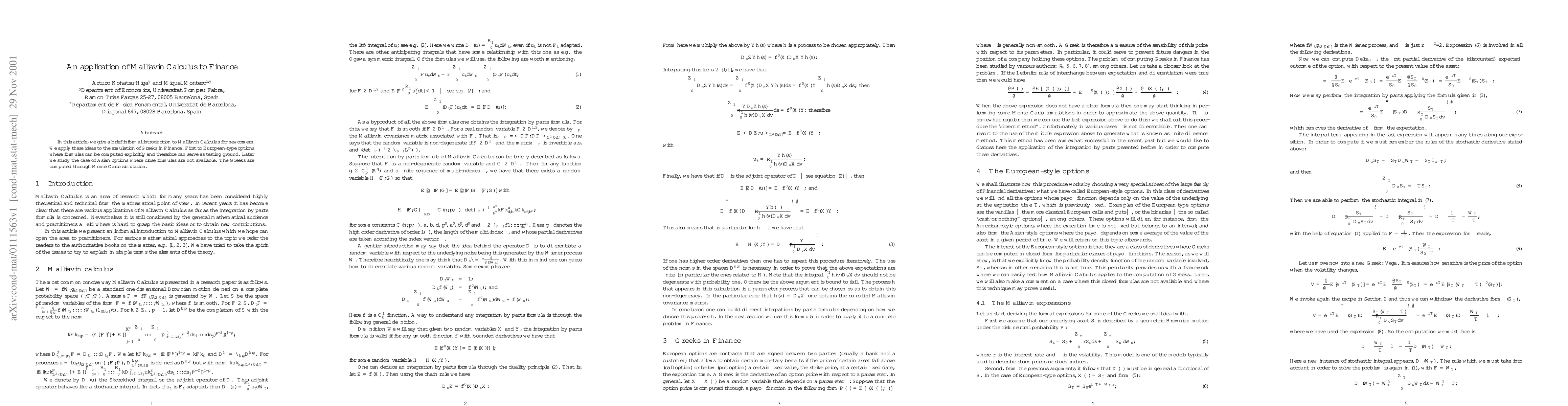 This paper applies Malliavin Calculus to finance, using it to simulate Greeks for European-type options where formulas can be computed explicitly and for Asian options through Monte Carlo simulation.