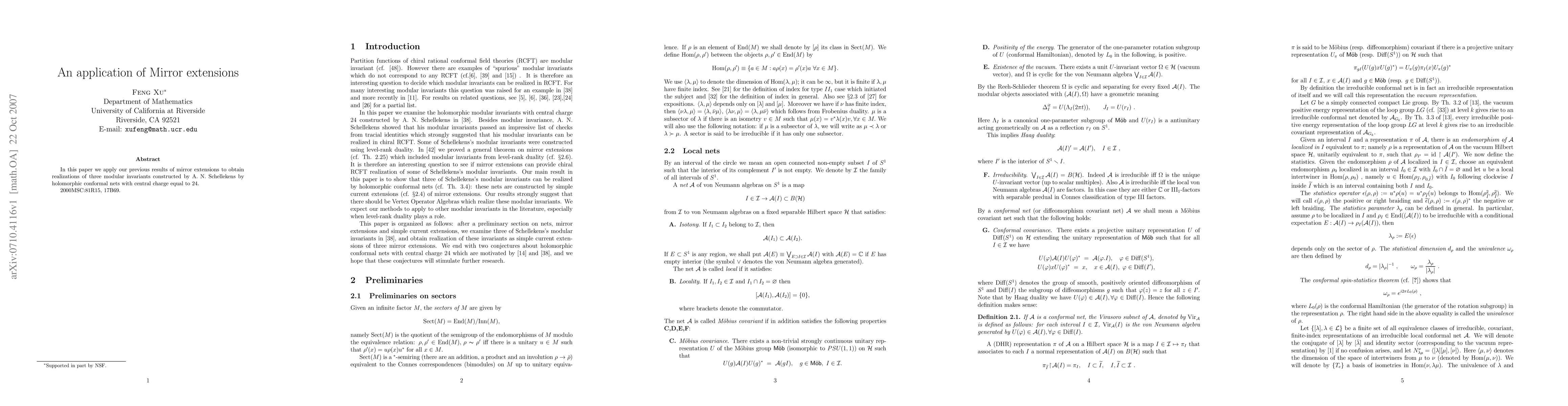 Summary: This paper utilizes prior findings on mirror extensions to realize three modular invariants formulated by A. N. Schellekens within holomorphic conformal nets characterized by a central charge of 24.