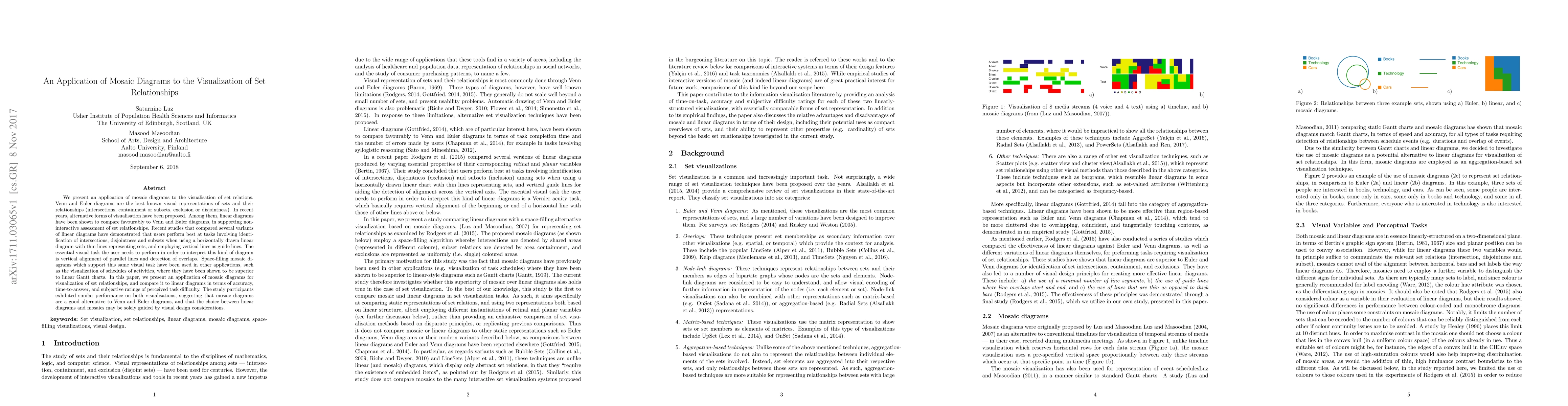 This paper explores mosaic diagrams as an alternative to traditional Venn and Euler diagrams for visualizing set relationships, finding similar accuracy and task performance compared to linear diagrams, indicating mosaic diagrams may offer an equally effective but visually distinct option. The study suggests that the preference between the two methods could depend on aesthetic and design factors.
