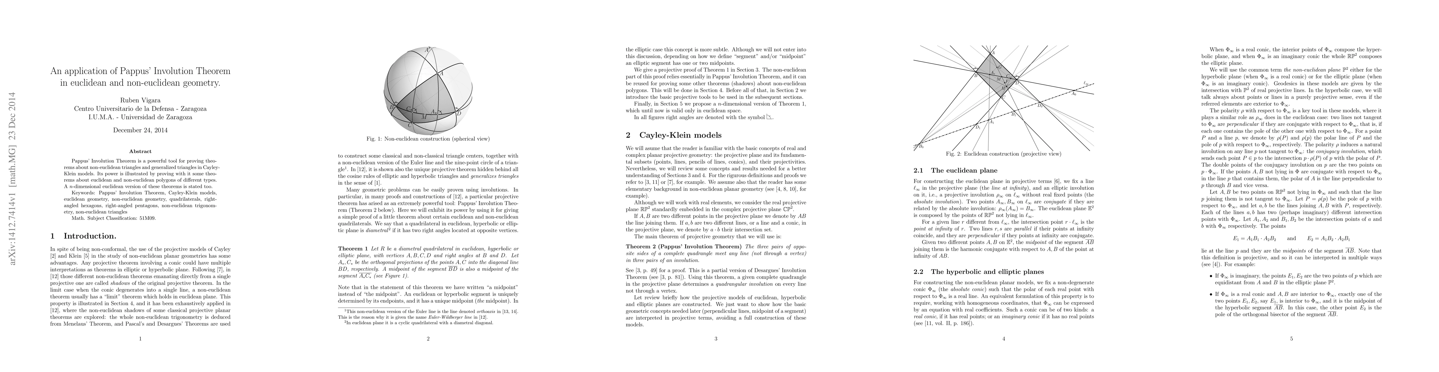 Pappus' Involution Theorem is utilized to prove theorems about non-Euclidean triangles and generalized triangles. It also facilitates the proof of theorems concerning various Euclidean and non-Euclidean polygons, with an extension into $n$-dimensional Euclidean geometry.