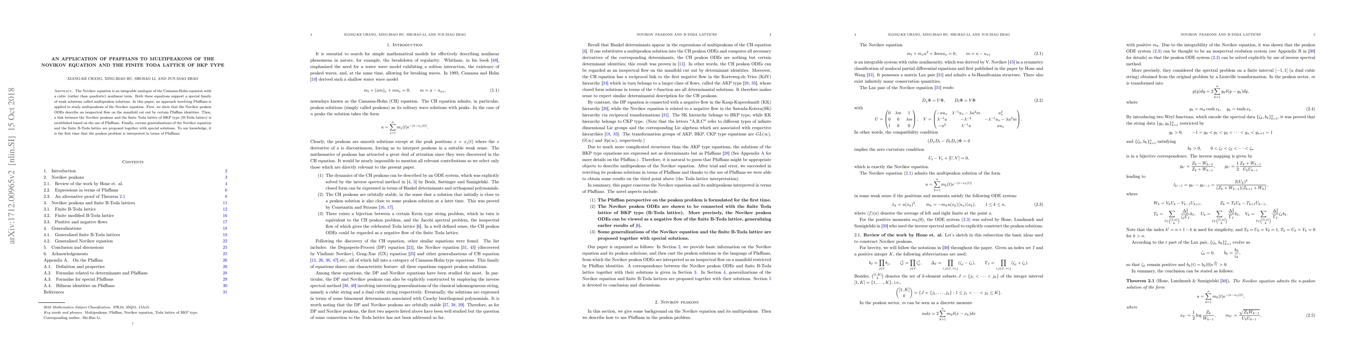The Novikov equation is an integrable analogue of the Camassa-Holm equation with a cubic (rather than quadratic) nonlinear term. Both these equations support a special family of weak solutions called multipeakon solutions. In this paper, an approach involving Pfaffians is applied to study multipeakons of the Novikov equation. First, we show that the Novikov peakon ODEs describe an isospectral flow on the manifold cut out by certain Pfaffian identities. Then, a link between the Novikov peakons and the finite Toda lattice of BKP type (B-Toda lattice) is established based on the use of Pfaffians. Finally, certain generalizations of the Novikov equation and the finite B-Toda lattice are proposed together with special solutions. To our knowledge, it is the first time that the peakon problem is interpreted in terms of Pfaffians.