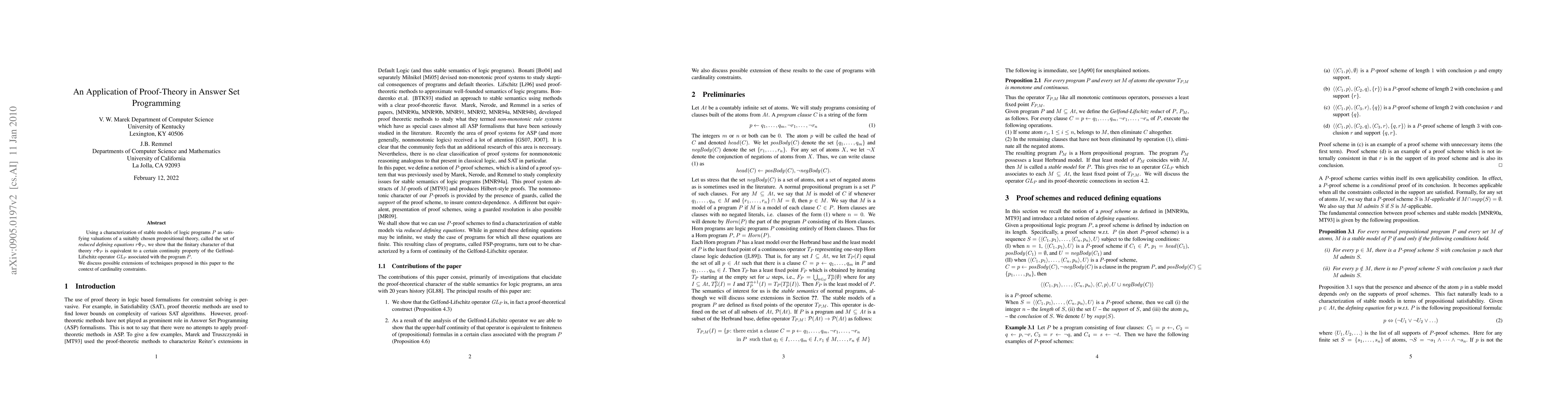 We apply proof-theoretic techniques in answer Set Programming. The main results include: 1. A characterization of continuity properties of Gelfond-Lifschitz operator for logic program. 2. A propositional characterization of stable models of logic programs (without referring to loop formulas.