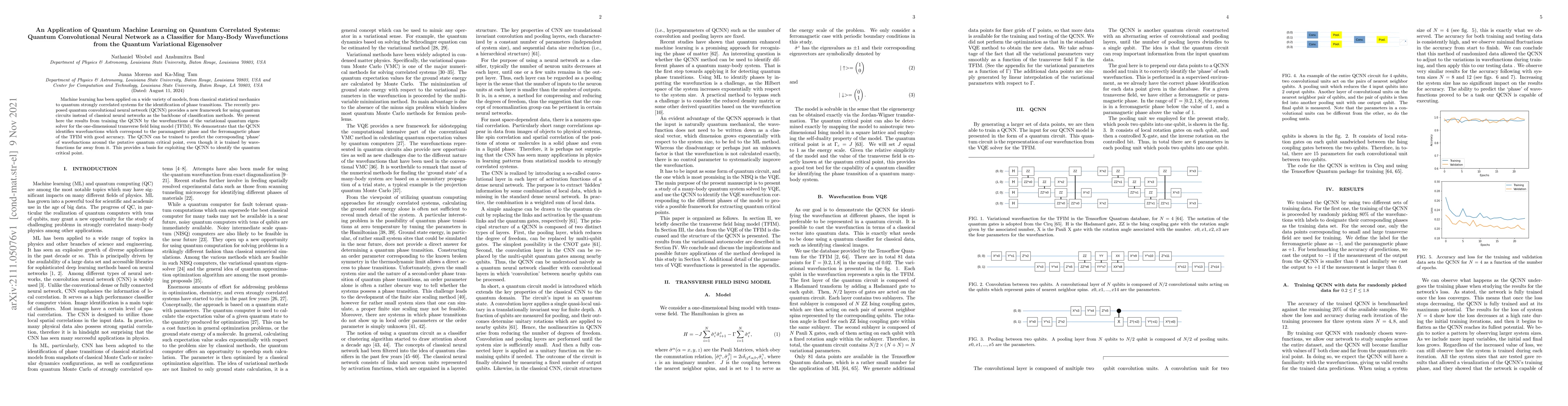 Machine learning has been applied on a wide variety of models, from classical statistical mechanics to quantum strongly correlated systems for the identification of phase transitions. The recently proposed quantum convolutional neural network (QCNN) provides a new framework for using quantum circuits instead of classical neural networks as the backbone of classification methods. We present here the results from training the QCNN by the wavefunctions of the variational quantum eigensolver for the one-dimensional transverse field Ising model (TFIM). We demonstrate that the QCNN identifies wavefunctions which correspond to the paramagnetic phase and the ferromagnetic phase of the TFIM with good accuracy. The QCNN can be trained to predict the corresponding phase of wavefunctions around the putative quantum critical point, even though it is trained by wavefunctions far away from it. This provides a basis for exploiting the QCNN to identify the quantum critical point.