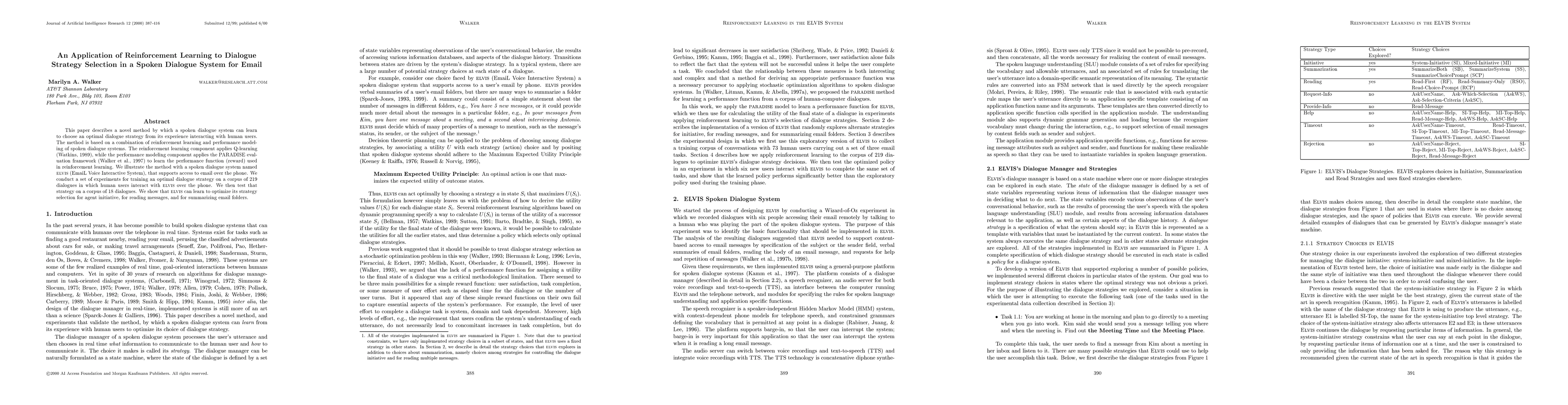 This paper proposes a reinforcement learning approach to optimize dialogue strategy selection in a spoken dialogue system for email, using Q-learning and the PARADISE framework. The ELVIS system was trained and tested on dialogue corpora, demonstrating improved strategy selection for agent initiative, message reading, and email folder summarization.