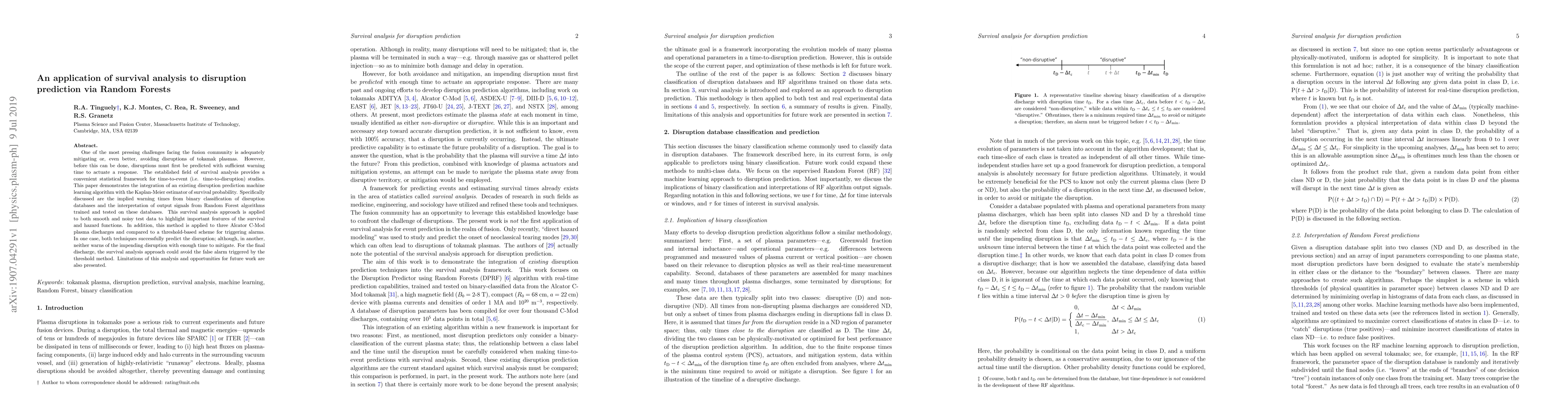 One of the most pressing challenges facing the fusion community is adequately mitigating or, even better, avoiding disruptions of tokamak plasmas. However, before this can be done, disruptions must first be predicted with sufficient warning time to actuate a response. The established field of survival analysis provides a convenient statistical framework for time-to-event (i.e. time-to-disruption) studies. This paper demonstrates the integration of an existing disruption prediction machine learning algorithm with the Kaplan-Meier estimator of survival probability. Specifically discussed are the implied warning times from binary classification of disruption databases and the interpretation of output signals from Random Forest algorithms trained and tested on these databases. This survival analysis approach is applied to both smooth and noisy test data to highlight important features of the survival and hazard functions. In addition, this method is applied to three Alcator C-Mod plasma discharges and compared to a threshold-based scheme for triggering alarms. In one case, both techniques successfully predict the disruption; although, in another, neither warns of the impending disruption with enough time to mitigate. For the final discharge, the survival analysis approach could avoid the false alarm triggered by the threshold method. Limitations of this analysis and opportunities for future work are also presented.