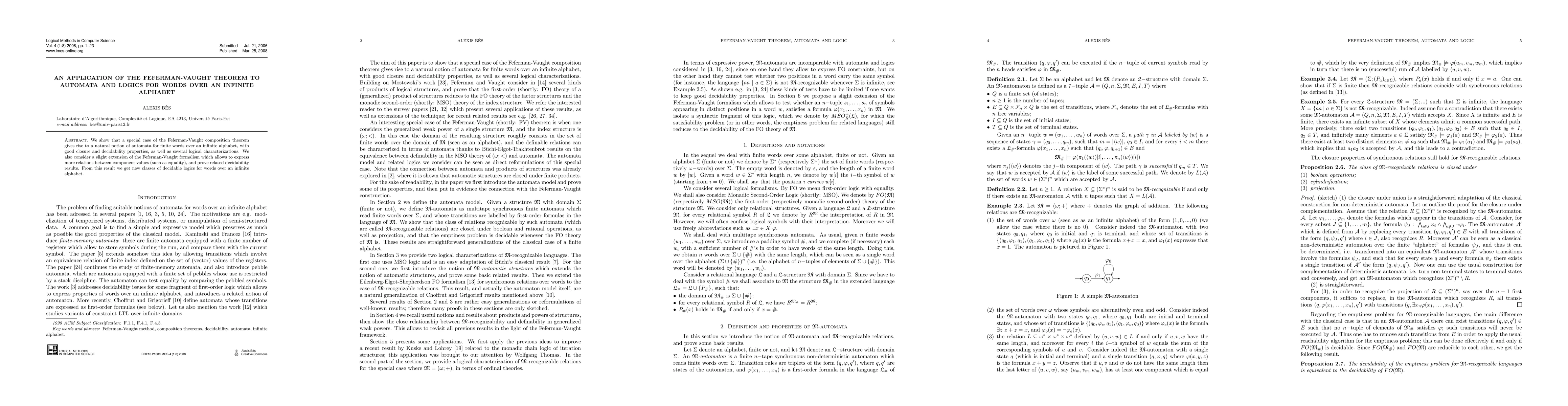 This paper applies the Feferman-Vaught theorem to develop automata for finite words over an infinite alphabet with strong closure and decidability properties, and introduces an extended formalism for expressing more complex relations, leading to new decidable logics for such words.