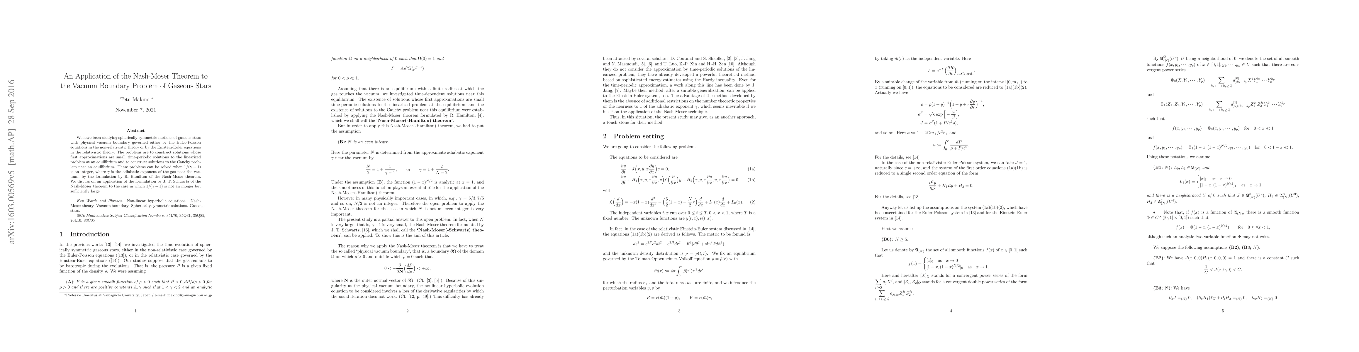 This paper applies the Nash-Moser theorem to solve the vacuum boundary problem for spherically symmetric gaseous stars, addressing both non-relativistic and relativistic scenarios. The authors extend the theorem's application to cases where the adiabatic exponent is not an integer but sufficiently large.