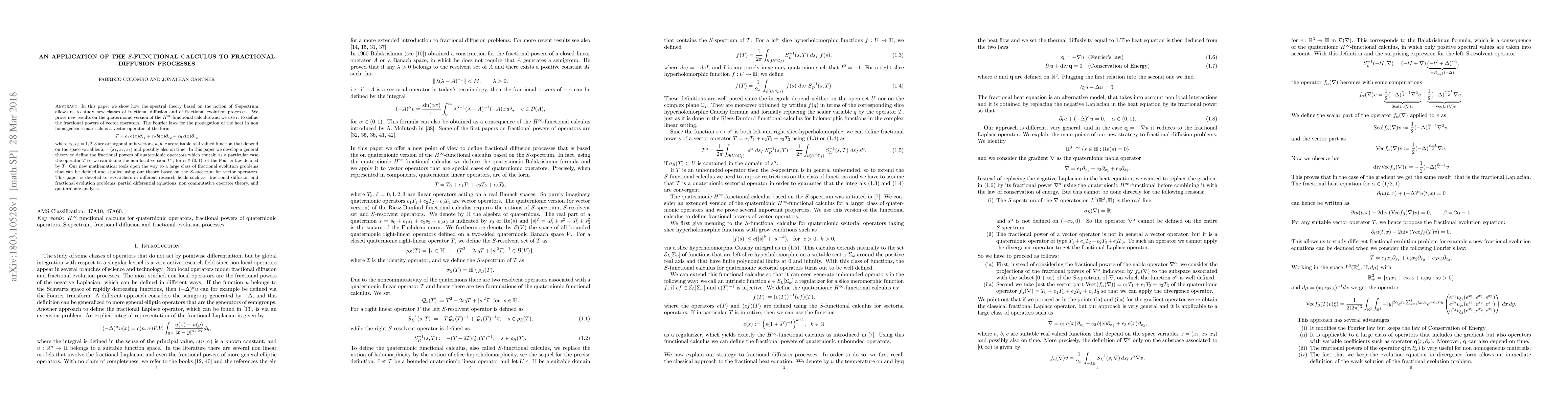 In this paper we show how the spectral theory based on the notion of $S$-spectrum allows us to study new classes of fractional diffusion and of fractional evolution processes. We prove new results on the quaternionic version of the $H^\infty$ functional calculus and we use it to define the fractional powers of vector operators. The Fourier laws for the propagation of the heat in non homogeneous materials is a vector operator of the form \[ T=e_1\,a(x)\partial_{x_1} + e_2\,b(x)\partial_{x_2} + e_3\,c(x)\partial_{x_3}, \] where $e_\ell$, $e_\ell=1,2,3$ are orthogonal unit vectors, $a$, $b$, $c$ are suitable real valued function that depend on the space variables $x=(x_1,x_2,x_3)$ and possibly also on time. In this paper we develop a general theory to define the fractional powers of quaternionic operators which contain as a particular case the operator $T$ so we can define the non local version $T^\alpha$, for $\alpha\in (0,1)$, of the Fourier law defined by $T$. Our new mathematical tools open the way to a large class of fractional evolution problems that can be defined and studied using our theory based on the $S$-spectrum for vector operators. This paper is devoted to researchers in different research fields such as: fractional diffusion and fractional evolution problems, partial differential equations, non commutative operator theory, and quaternionic analysis.