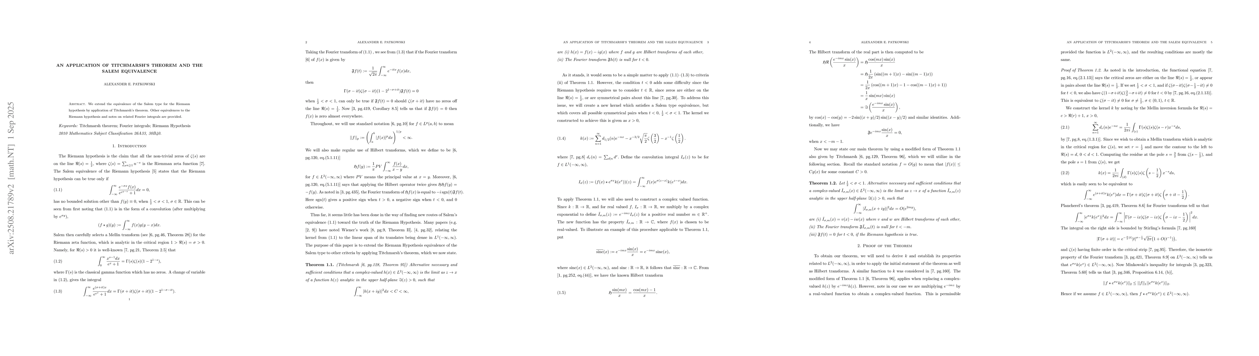 We extend the equivalence of the Salem type for the Riemann hypothesis by application of Titchmarsh's theorem. Other equivalences to the Riemann hypothesis and notes on related Fourier integrals are provided.